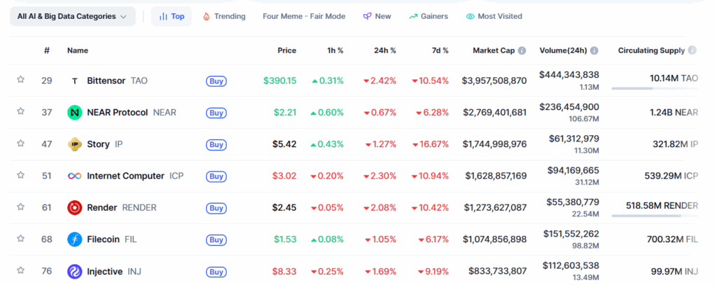 وفقًا للبيانات المجمعة من CoinMarketCap، فإن العملات الرائدة المدعومة بالذكاء الاصطناعي قد مرت بأسبوع سيء للغاية، مظهرة انخفاضات كبيرة. أظهرت العملات الرائدة، مثل Bittensor (TAO) و Render (RNDR) و Internet Computer (ICP)، انخفاضات أسبوعية تصل إلى 5-15% مما يظهر التصحيح قصير المدى.