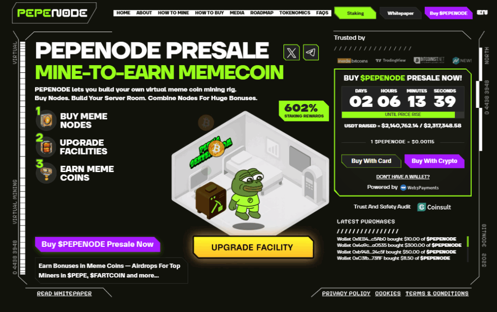 يمكن أن يكون تعدين العملات المشفرة التقليدي مكلفًا ويصعب الوصول إليه، لكن Pepenode يقدم بديلاً تفاعليًا منخفض التكلفة يدمج بين الألعاب وتراكم العملات المشفرة. المشروع حاليًا في مرحلة ما قبل البيع، وقد جمع بالفعل ما يقرب من 2.2 مليون دولار.