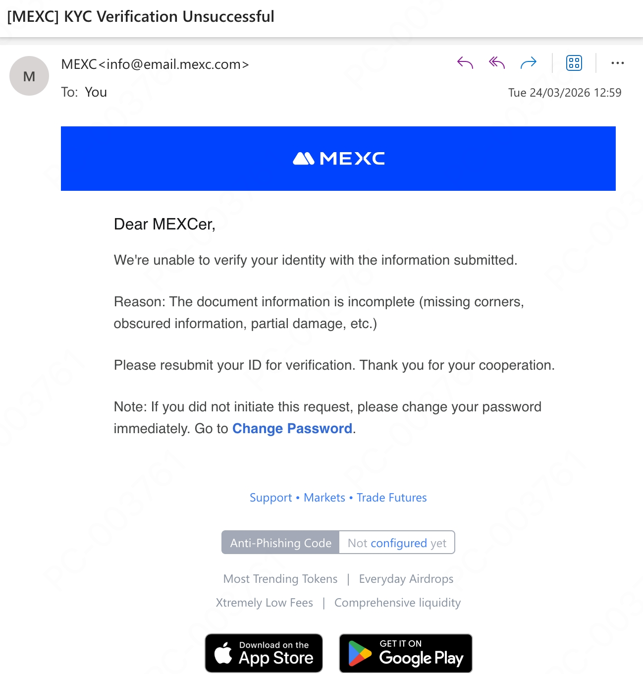 بعد تقديم التحقق من KYC، سترسل لك MEXC النتيجة عبر البريد الإلكتروني. إذا لم يتم الموافقة على طلبك، يمكنك التحقق من السبب في البريد الإلكتروني المرسل إلى العنوان المسجل في حسابك على MEXC.