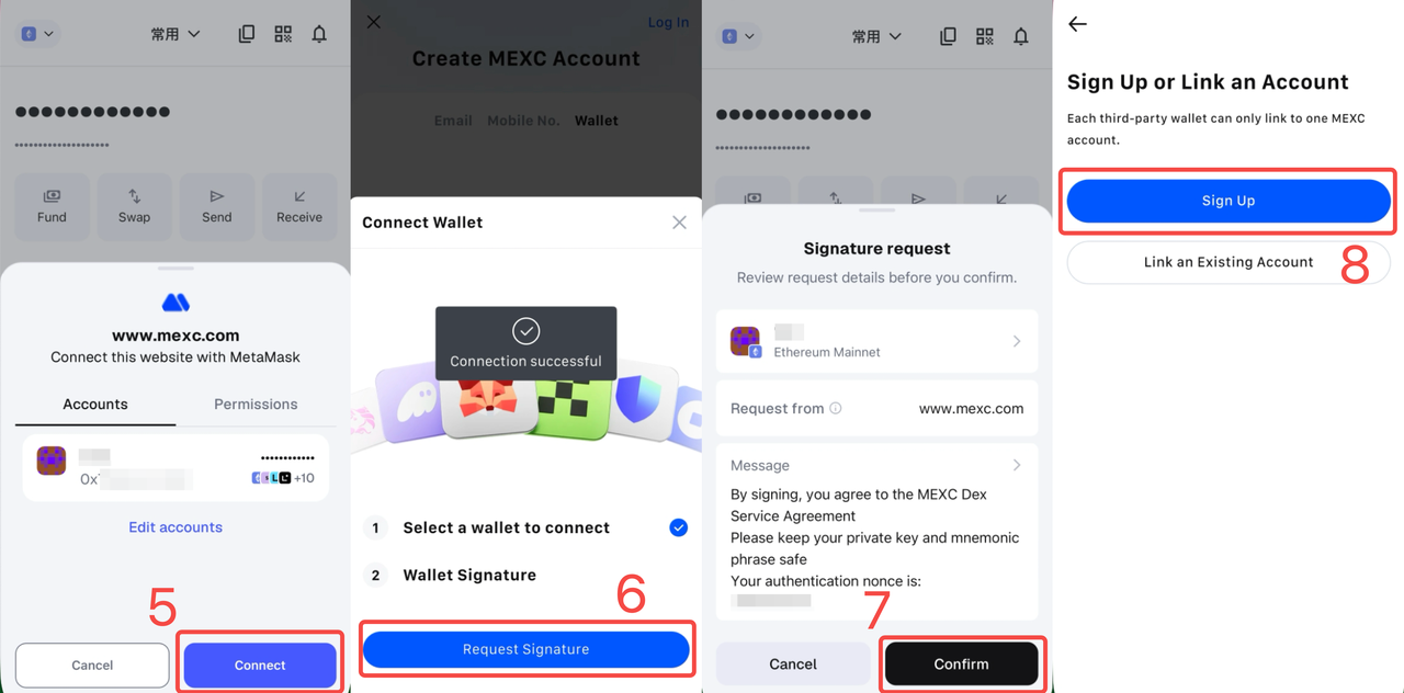 6) Sobald die Verbindung hergestellt ist, erscheint in der MEXC App ein Bestätigungs-Pop-up, und neben Wallet auswählen wird ein ☑︎-Symbol angezeigt. Tippen Sie anschließend auf Signatur anfordern.