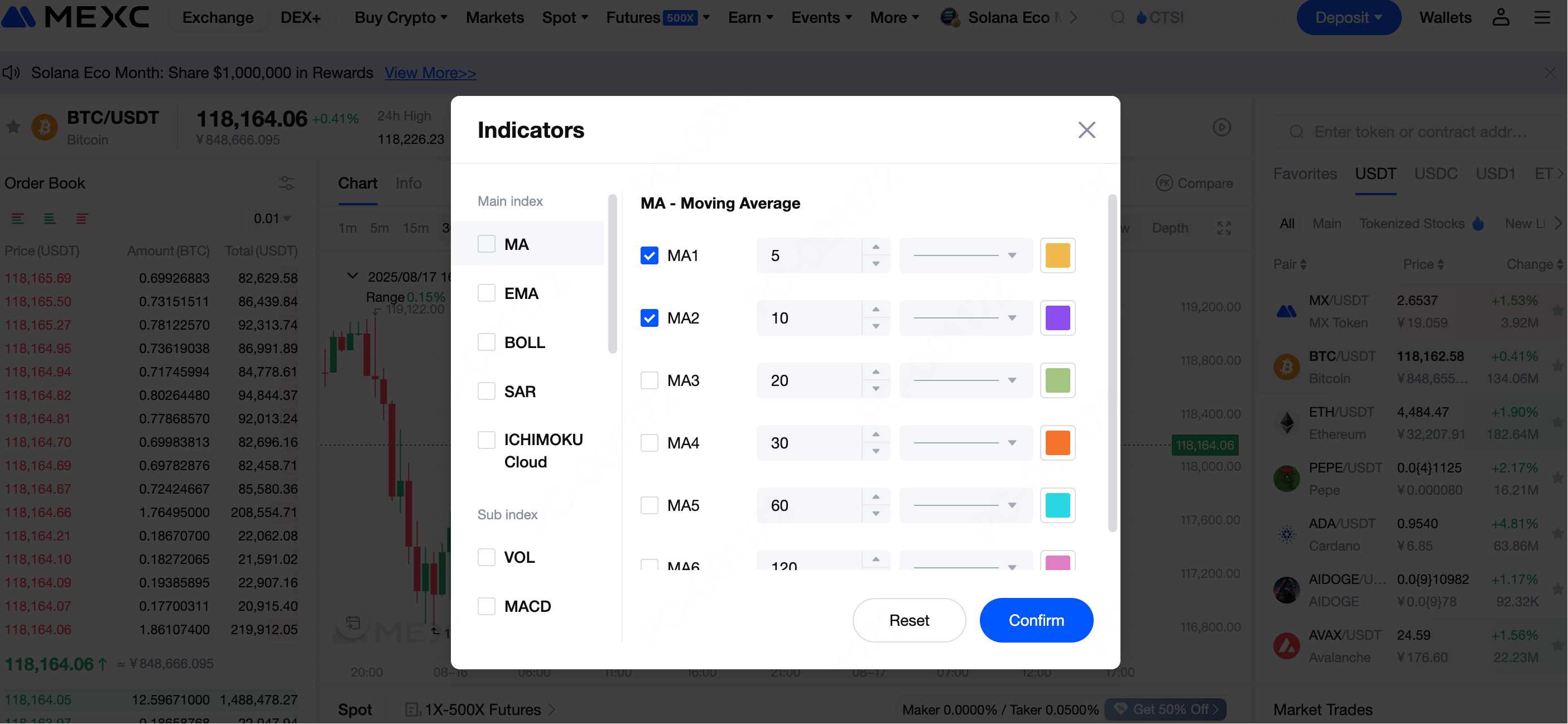 Im Kryptohandel bezieht sich die Analyse technischer Indikatoren auf eine quantitative Methode, die mathematische und statistische Formeln verwendet, um Markttrends zu bewerten. Durch die Verarbeitung von Kurs- und Volumendaten mit spezifischen Berechnungen liefert sie Investoren intuitive Einblicke in die Marktrichtung. MEXC bietet eine breite Palette an Werkzeugen für die technische Analyse, darunter klassische Indikatoren wie Moving Average (MA), Exponential Moving Average (EMA), Moving Average Convergence Divergence (MACD), Bollinger Bands (BOLL) und den Relative Strength Index (RSI).