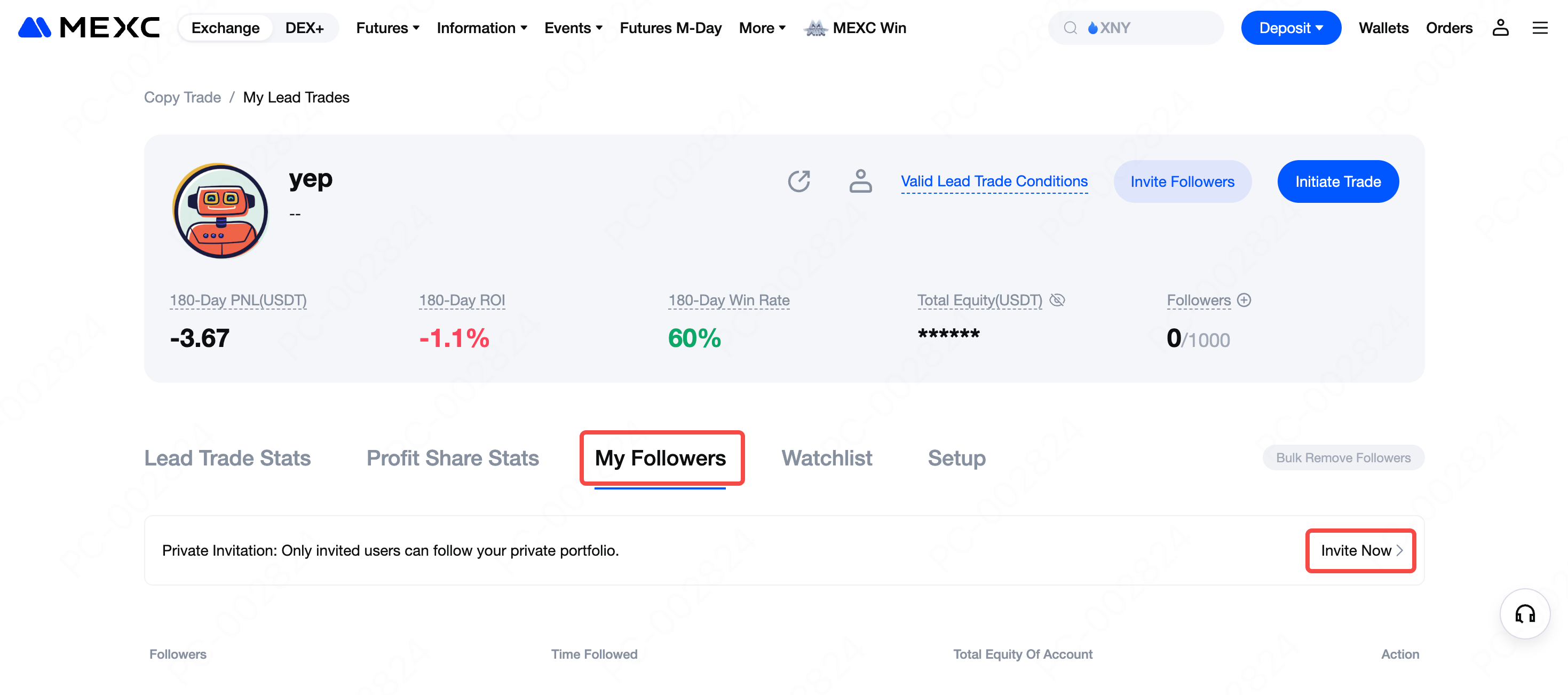 Auf der Meine Lead-Handel-Seite klicken Sie auf Meine Follower, um Ihre aktuellen Follower, den Zeitpunkt der Follower-Registrierung und das Gesamtkapital im Copy-Trading-Konto einzusehen. Um einen Follower vorübergehend auszuschließen, klicken Sie unter Aktion auf Ausschließen.