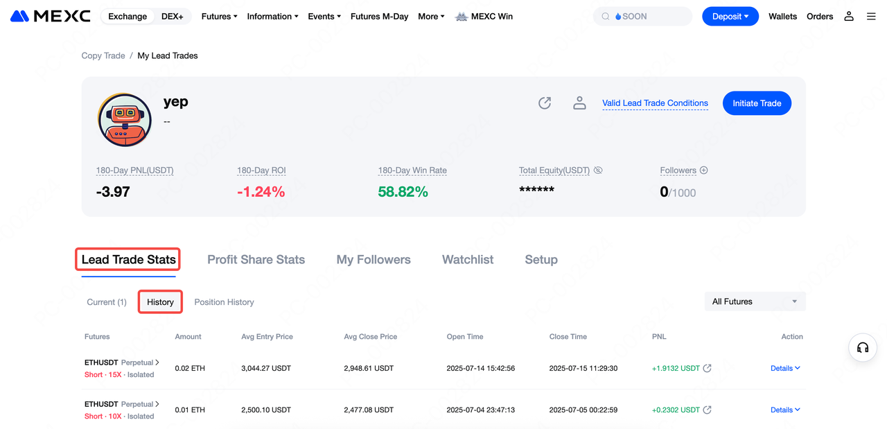 Auf der Meine Lead-Handel-Seite klicken Sie auf Historie im Lead-Handel-Statistiken-Tab, um Ihre vergangene Copy-Trading-Historie einzusehen.
