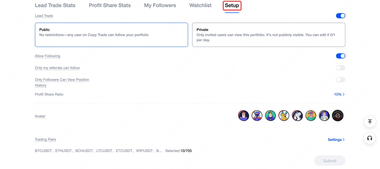 Auf der Meine Lead-Handel-Seite klicken Sie auf Einrichten. Sie können die Lead-Handel-Funktion ein- oder ausschalten, Follower zulassen oder einschränken, die Option aktivieren, dass nur geworbene Benutzer folgen dürfen, und festlegen, dass die Positionshistorie nur für Follower sichtbar ist. Sie können außerdem Ihren Avatar, Copy-Trading-Paare, Spitznamen und Ihre Biografie festlegen. Nach Abschluss klicken Sie auf Absenden, um die Änderungen zu übernehmen.