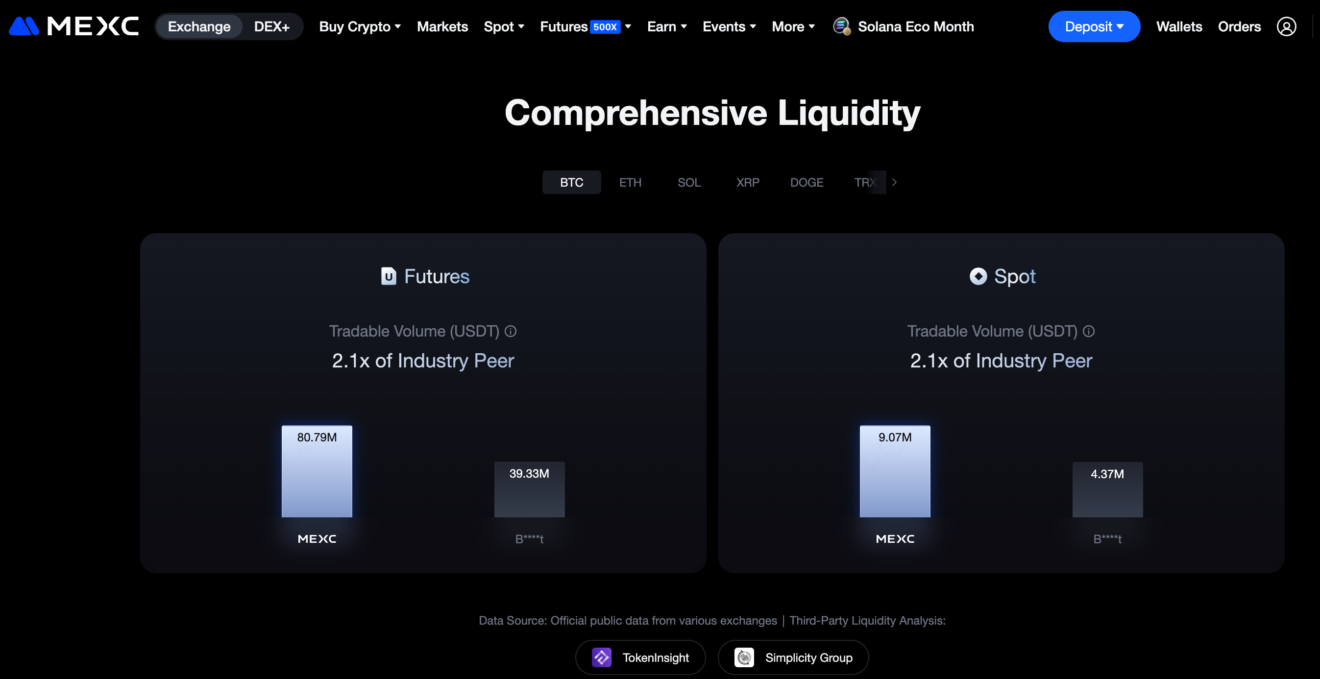 Zum Beispiel beim Handelspaar BTCUSDT: Wird das gesamte Limit-Auftragsvolumen innerhalb von ±5 Basispunkten des Mittelkurses berechnet, zeigt das Orderbuch von MEXC etwa 80.79 Millionen USDT, während ein globaler Top-3-Wettbewerber rund 39.33 Millionen USDT aufweist. Das bedeutet, dass die Liquidität von MEXC etwa 2.1-mal höher ist als die des Branchenführers.