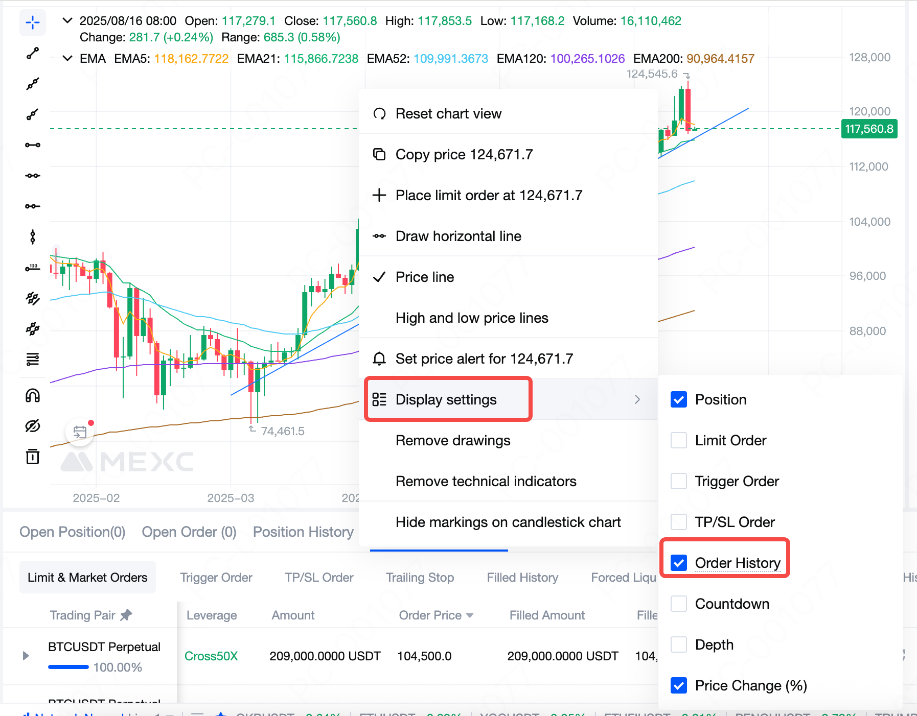 Klicken Sie im Kerzenchart mit der rechten Maustaste, um das Schnellmenü zu öffnen, wählen Sie Anzeigeeinstellungen und aktivieren Sie Auftragsverlauf. Anschließend sehen Sie rote Abwärtspfeile für Verkaufsaufträge und grüne Aufwärtspfeile für Kaufaufträge, die Ihre ausgeführten historischen Aufträge darstellen.