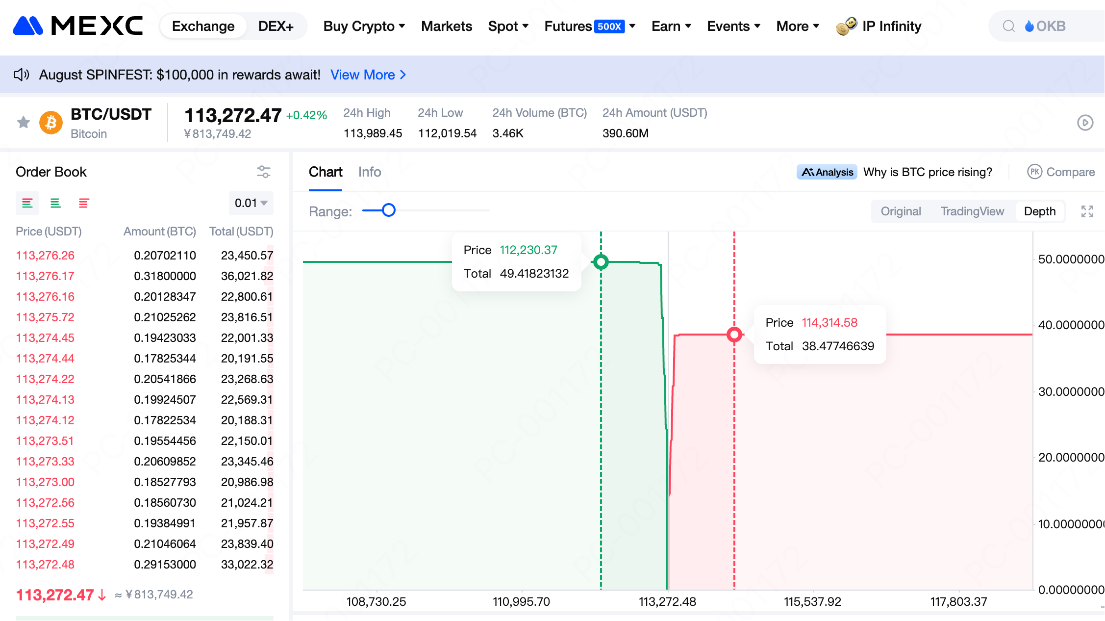 Am Beispiel des BTC-Depth-Diagramms zeigt das Diagramm Kauf- und Verkaufsaufträge auf verschiedenen Preisebenen. Der grüne Bereich links stellt die Kaufseite dar und zeigt die Menge an BTC, die Käufer zu unterschiedlichen Preisen erwerben möchten. Der rote Bereich rechts stellt die Verkaufsseite dar und zeigt die Menge, die Verkäufer bereit sind zu verkaufen. Aus dem Diagramm ist zu erkennen, dass es eine starke Kaufunterstützung um 112,230.37 USDT gibt, während in der Nähe von 114,314.58 USDT ein signifikanter Verkaufsdruck auftritt.