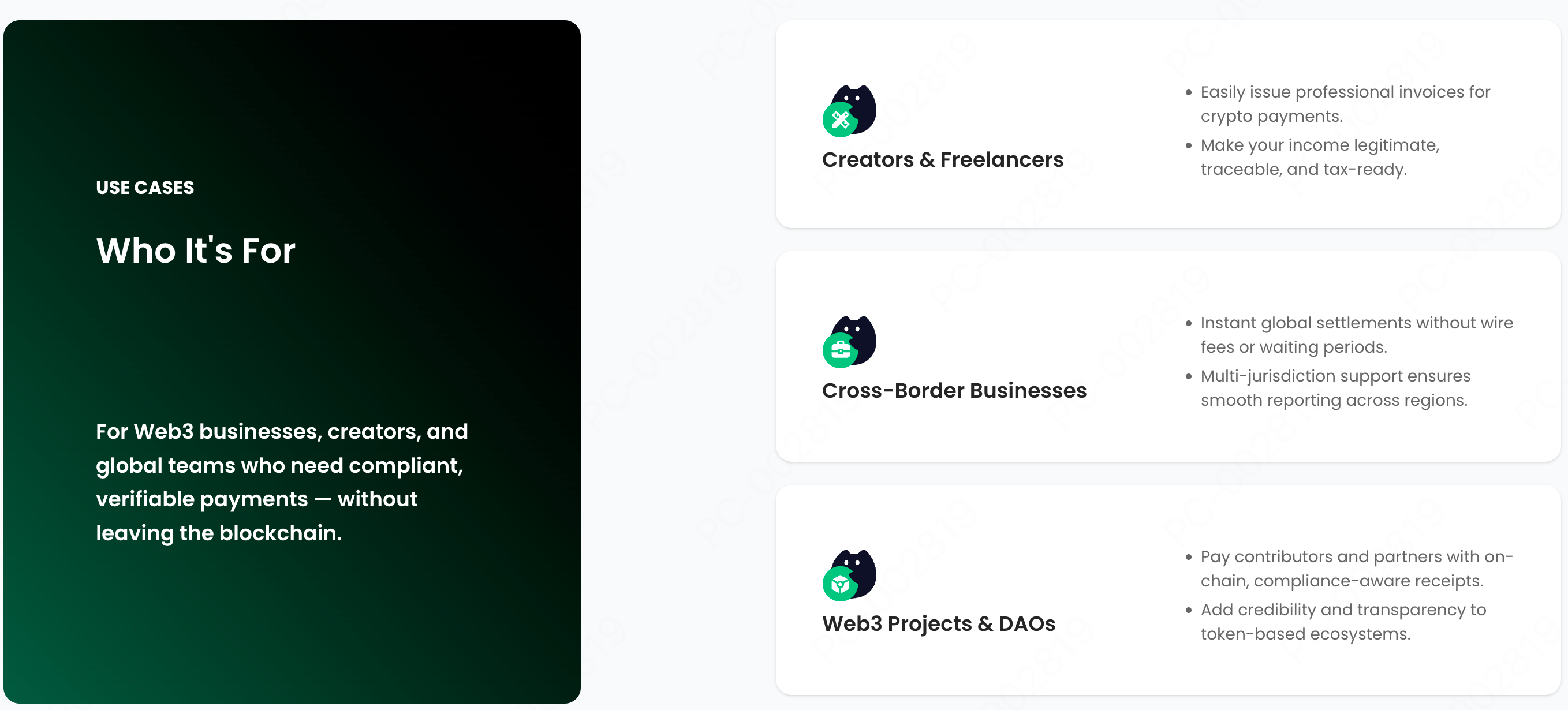 Freelancer & Creator: Pieverse ermöglicht es Einzelpersonen, professionelle Rechnungen und steuerbereite Belege für Kryptowährungseinnahmen zu erstellen und vereinfacht damit die finanzielle Berichterstattung und Einhaltung steuerlicher Vorschriften.