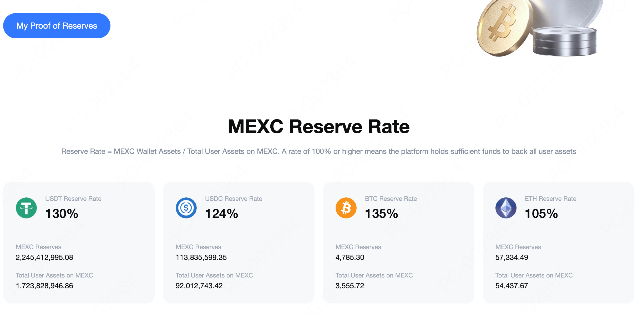 Proof of Reserves (PoR): To ensure the transparency of the platform's funds, MEXC has provided a Proof of Reserves (Proof of Reserves) system , allowing users to view the platform's reserve status in real time. MEXC promises to provide 1:1 reserve protection for every user asset and provide more than 100% reserve support.