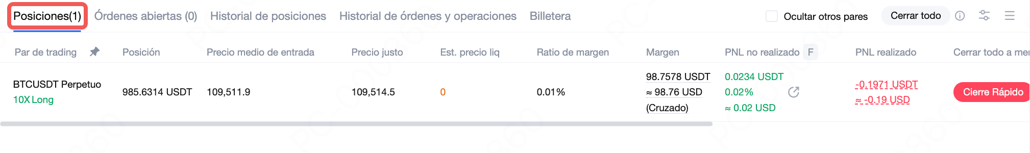 Los usuarios pueden ver sus posiciones abiertas actuales en la parte inferior de la interfaz de trading de futuros. Se mostrará información como el tamaño de la posición, el precio estimado de liquidación y el PNL no realizado. Aquí, los usuarios también pueden añadir margen a sus posiciones para reducir el riesgo de liquidación.