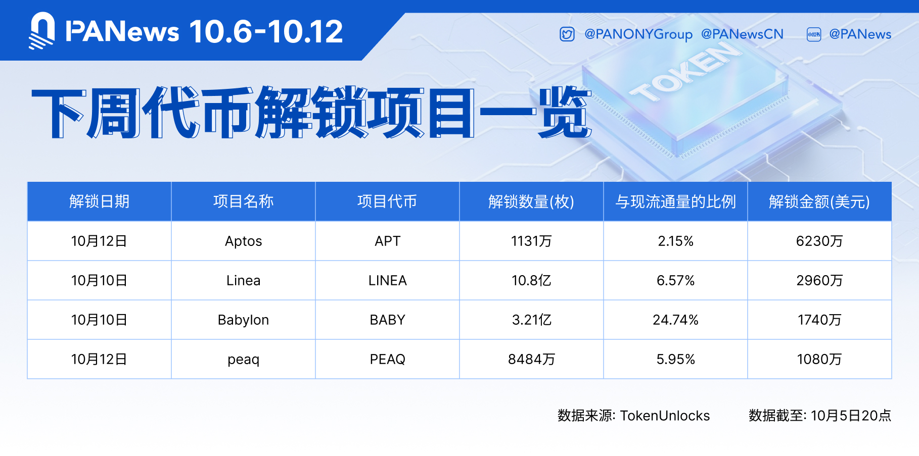 PANews informó el 5 de octubre que los datos de Token Unolcks mostraron que tokens como APT, LINEA, BABY y PEAQ atraerán grandes cantidades de desbloqueo la próxima semana, incluyendo: