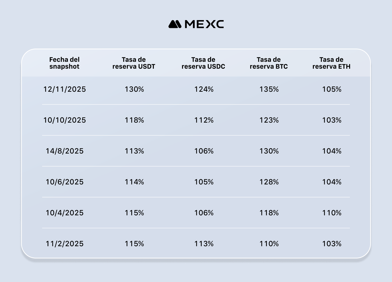 Estas cifras muestran que las reservas de MEXC para todos los principales activos están muy por encima del 100%, lo que indica que la plataforma mantiene un colchón de excedente para garantizar la cobertura total de los activos de los usuarios incluso bajo condiciones extremas del mercado.