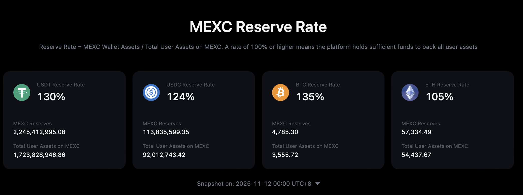 Entre ellos, MEXC fue uno de los primeros en sistematizar su PoR. Su enfoque ilustra la lógica completa de PoR en la práctica: revela públicamente las tasas de reserva, divulga las estructuras de activos y mantiene estabilidad a largo plazo mediante snapshots continuos. Los siguientes son los datos de snapshot más recientes publicados por MEXC, que sirven como referencia útil para entender cómo opera PoR en escenarios reales.
