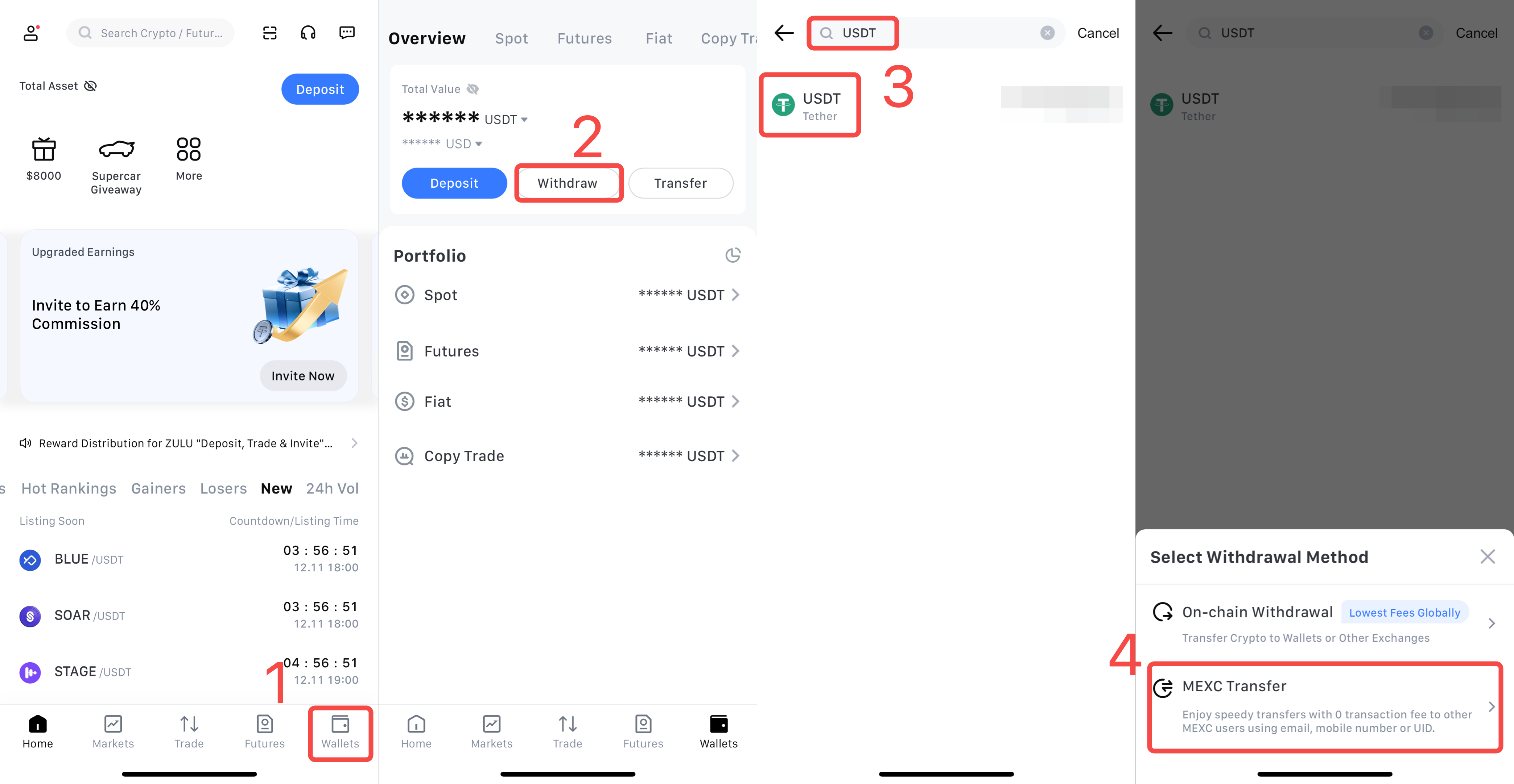 4) روش برداشت را روی انتقال داخلی MEXC قرار دهید.