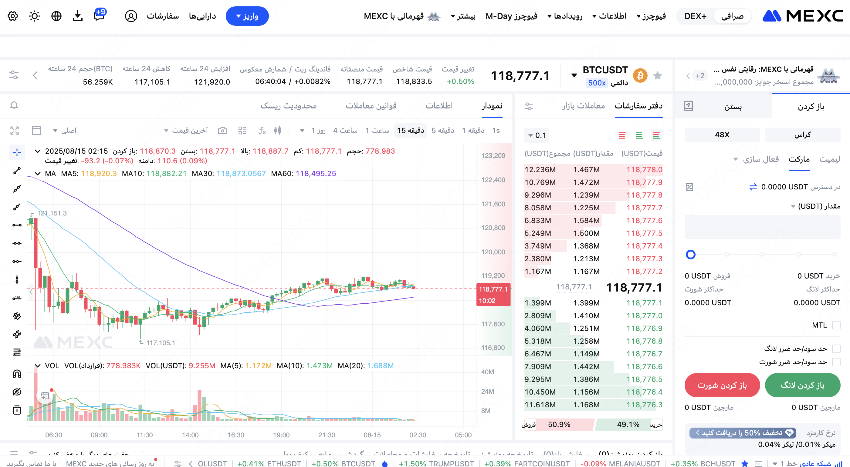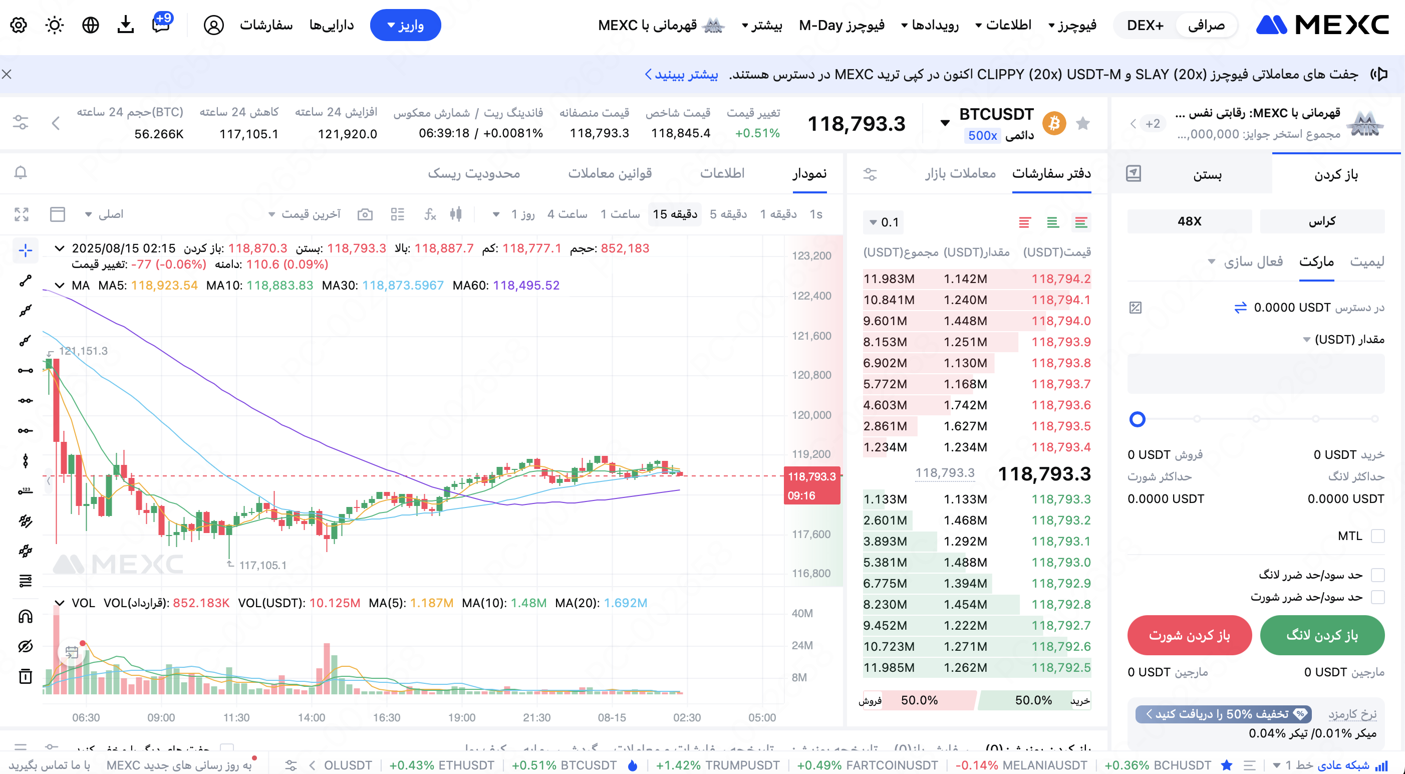 برای مثال، در معاملات فیوچرز دائمی BTC بین 24 تا 27 ژوئیه، خط قیمت بالا–پایین نشان دهنده بالاترین قیمت 119,445.2 USDT و پایین ترین قیمت 114٬672.9 USDT است. این مقادیر دامنه نوسان قیمت در آن بازه را مشخص می کنند. همزمان، خط قیمت سبز در 116,829.8 USDT نمایانگر قیمت بسته شدن فعلی بازار است.