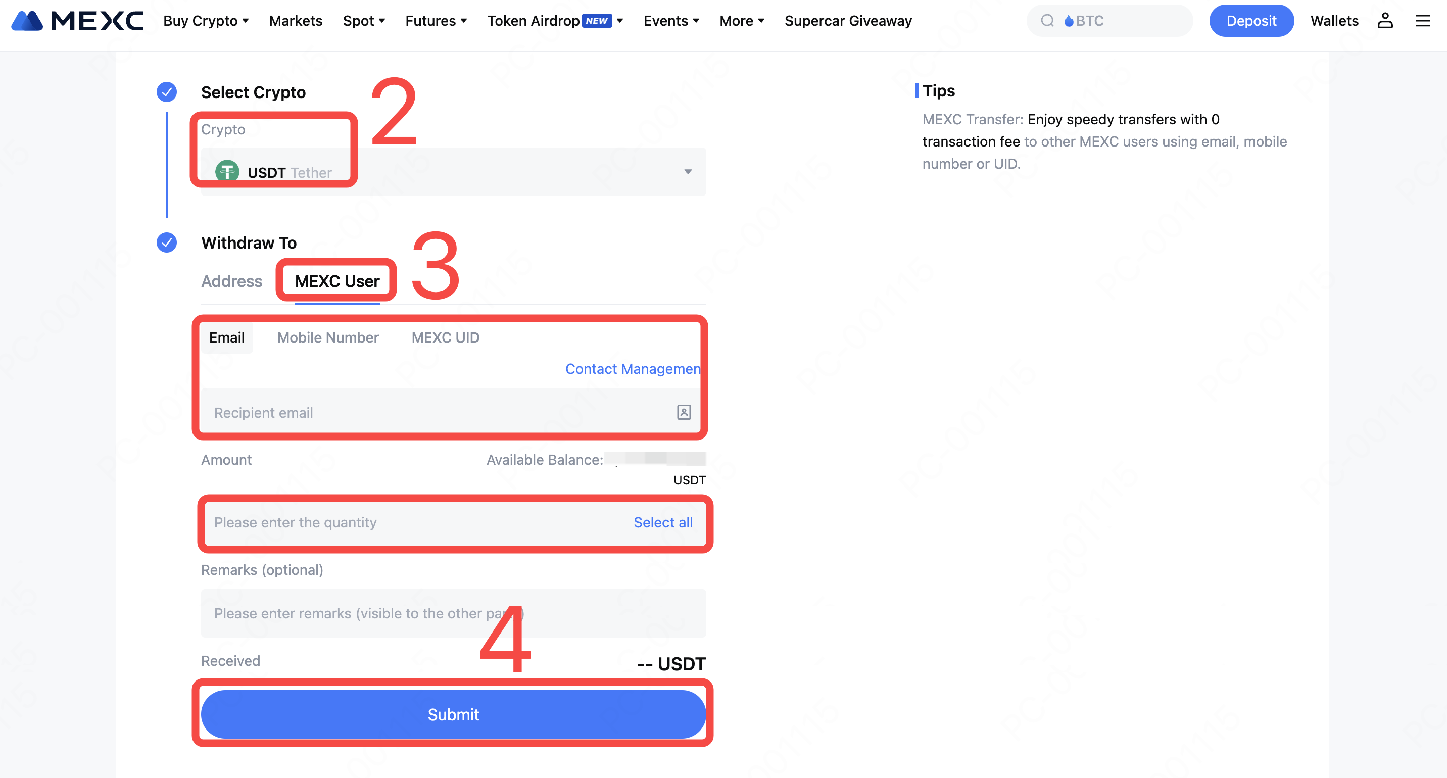 3) Sélectionnez Utilisateur de MEXC. Actuellement, trois méthodes de transfert sont prises en charge : E-mail, Numéro de téléphone mobile ou identifiant utilisateur (UID) de MEXC. Veuillez saisir les informations du compte du destinataire.