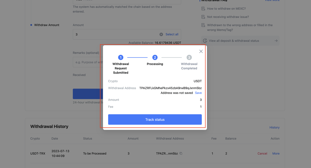 3) Si le système affiche Adresse invalide après avoir saisi l'adresse de retrait, veuillez vérifier attentivement l'adresse ou contacter le service client en ligne pour obtenir de l'aide.