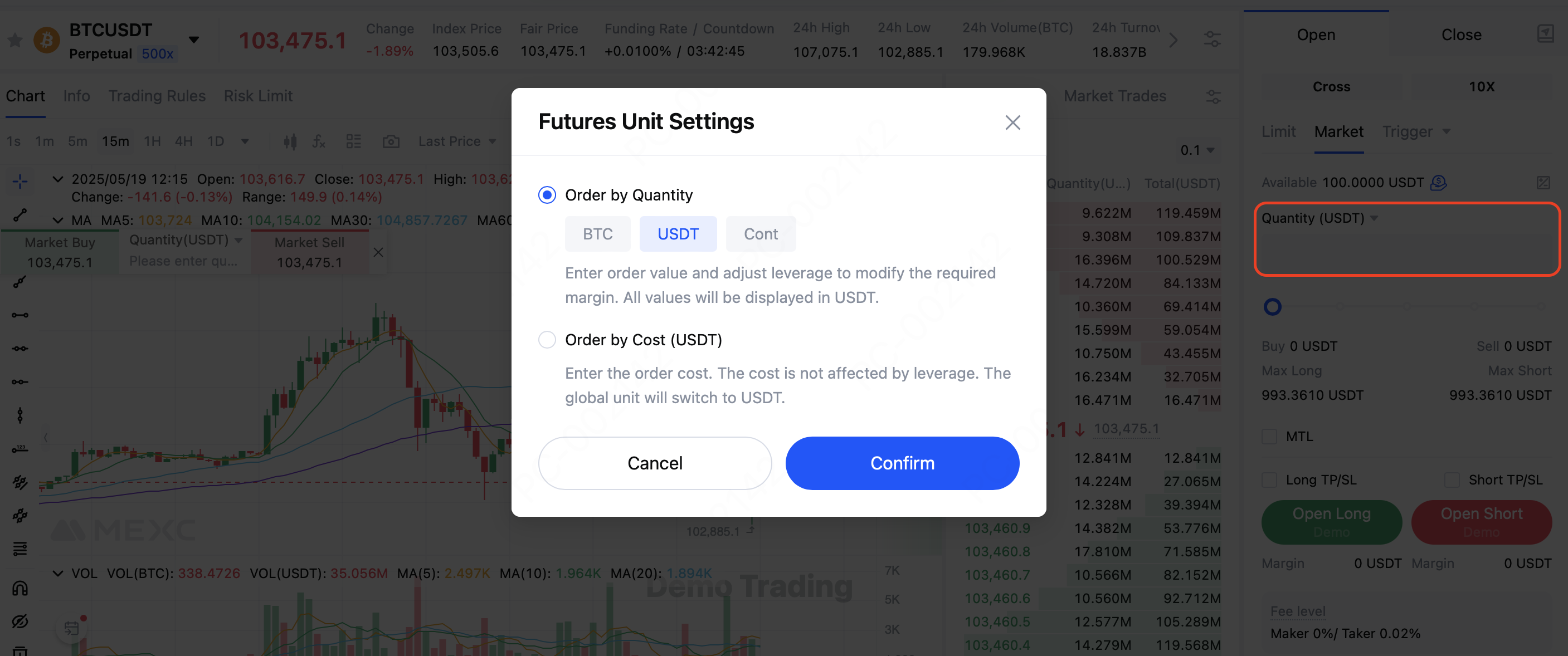 Parce que le [Mode de position], le [Mode de marge] et le [Mode d'effet de levier] peuvent avoir un impact significatif sur vos gains et pertes dans le trading de contrats à terme, MEXC recommande de suivre ces étapes pour placer un ordre :