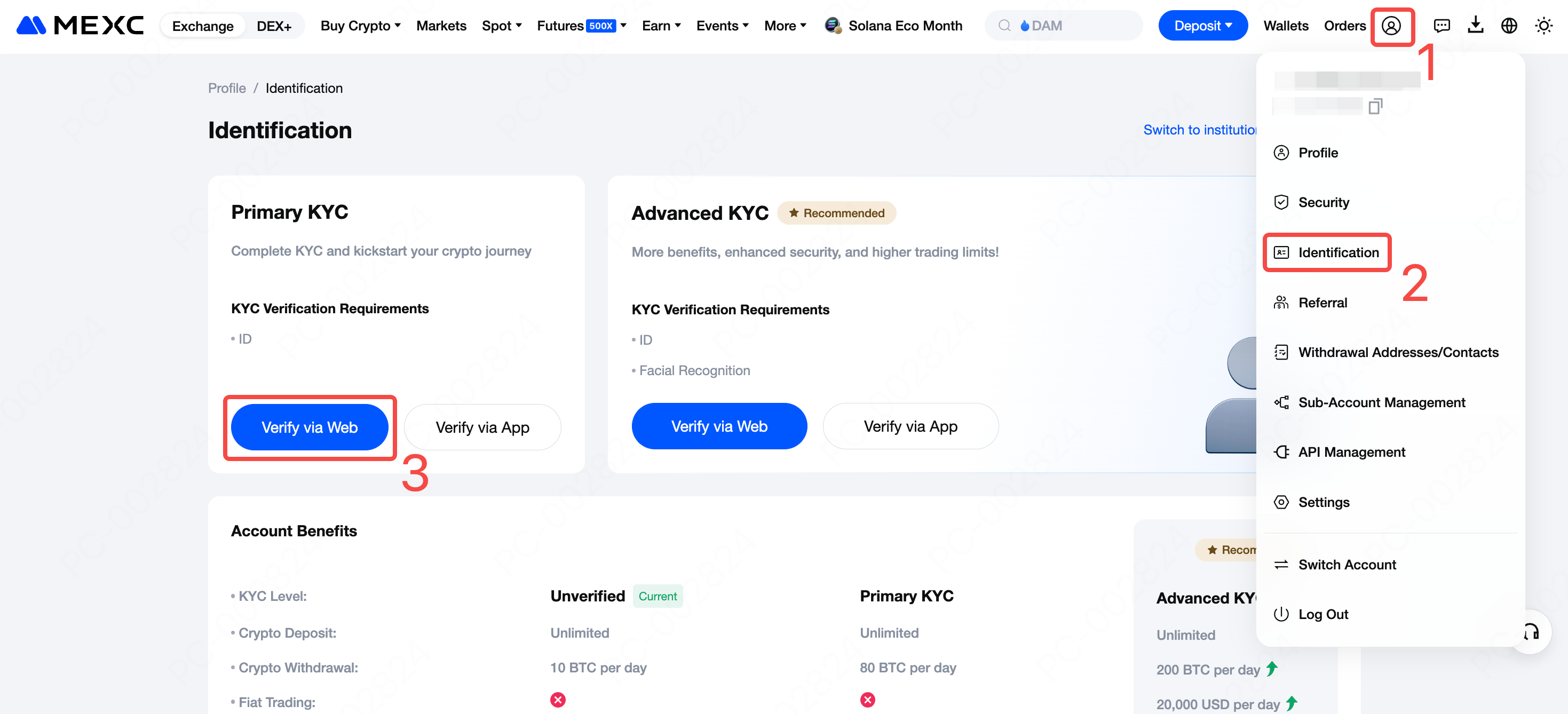 Masuk ke situs web resmi MEXC. Dari bilah navigasi, klik ikon pengguna, lalu pilih Identifikasi untuk membuka halaman verifikasi KYC. Dalam bagian KYC Dasar, klik tombol Verifikasi Melalui Web.