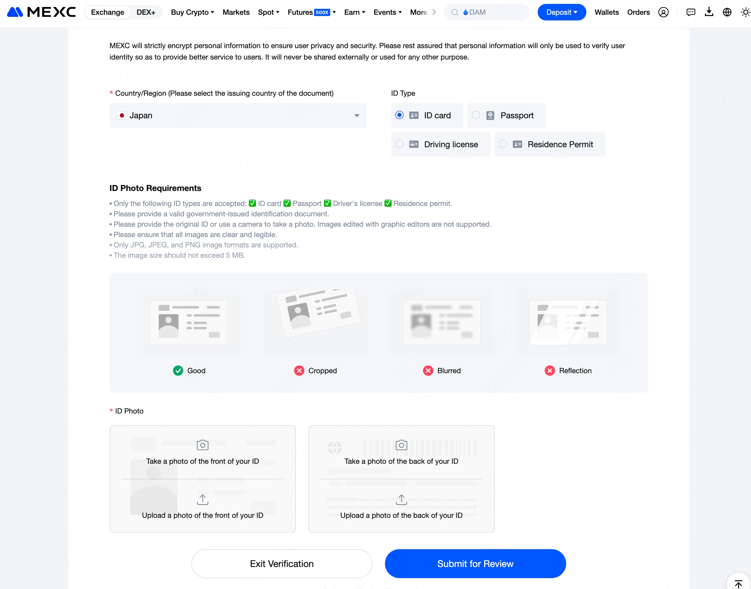 5) Ambil gambar baru atau unggah foto bagian depan dan belakang dari dokumen ID Anda. Untuk memastikan persetujuan, foto harus jelas dan lengkap dengan keempat sudut terlihat jelas. Anda dapat mengambil foto baru secara langsung atau mengunggah foto lama dari album lokal Anda.