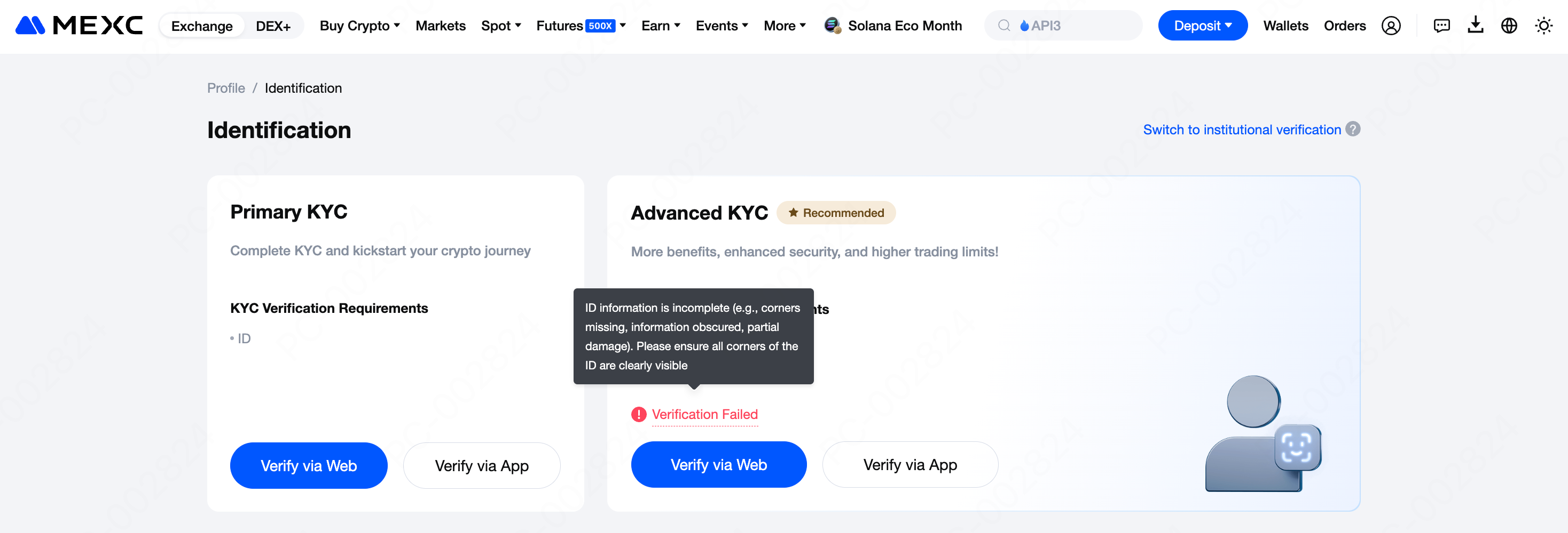 1 | Informasi dokumen tidak valid atau tidak lengkap. Pastikan nama lengkap dan foto Anda terlihat jelas atau kirimkan jenis dokumen lain. | Foto dokumen buram atau sebagian tidak terbaca, sehingga tidak dapat diverifikasi oleh sistem. Jenis dokumen ini tidak didukung oleh MEXC. | Pastikan foto dokumen jelas dan terbaca, terutama detail penting seperti nama lengkap dan foto. Ambil ulang, lalu unggah dokumen yang valid. MEXC hanya mendukung jenis dokumen berikut: KTP, paspor, SIM, izin tinggal. |