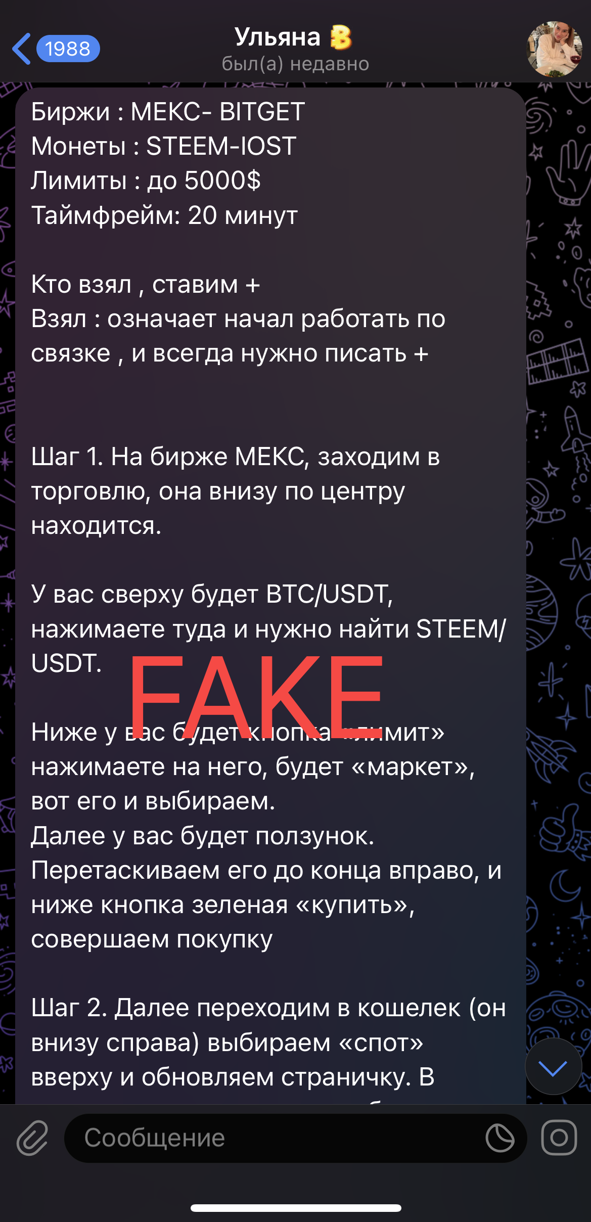Penipu dapat membuat grup Telegram dengan nama seperti "MEXC Official Arbitrage Group" dan menawarkan peluang arbitrase palsu. Mereka menginstruksikan pengguna untuk mengirim ETH ke dompet tertentu dengan imbalan token MX. Namun, token yang dikirim kembali adalah palsu dan tidak dikeluarkan oleh MEXC.
