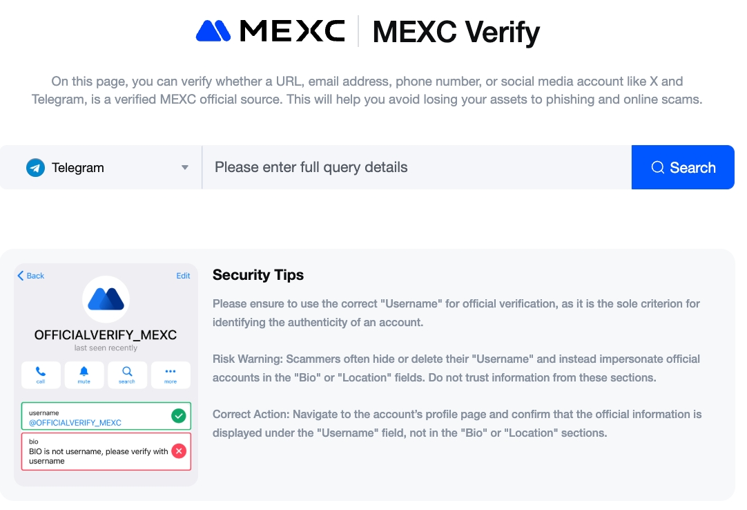 Anda dapat menggunakan Verifikasi MEXC untuk mengidentifikasi dan mengonfirmasi apakah suatu akun adalah akun resmi.