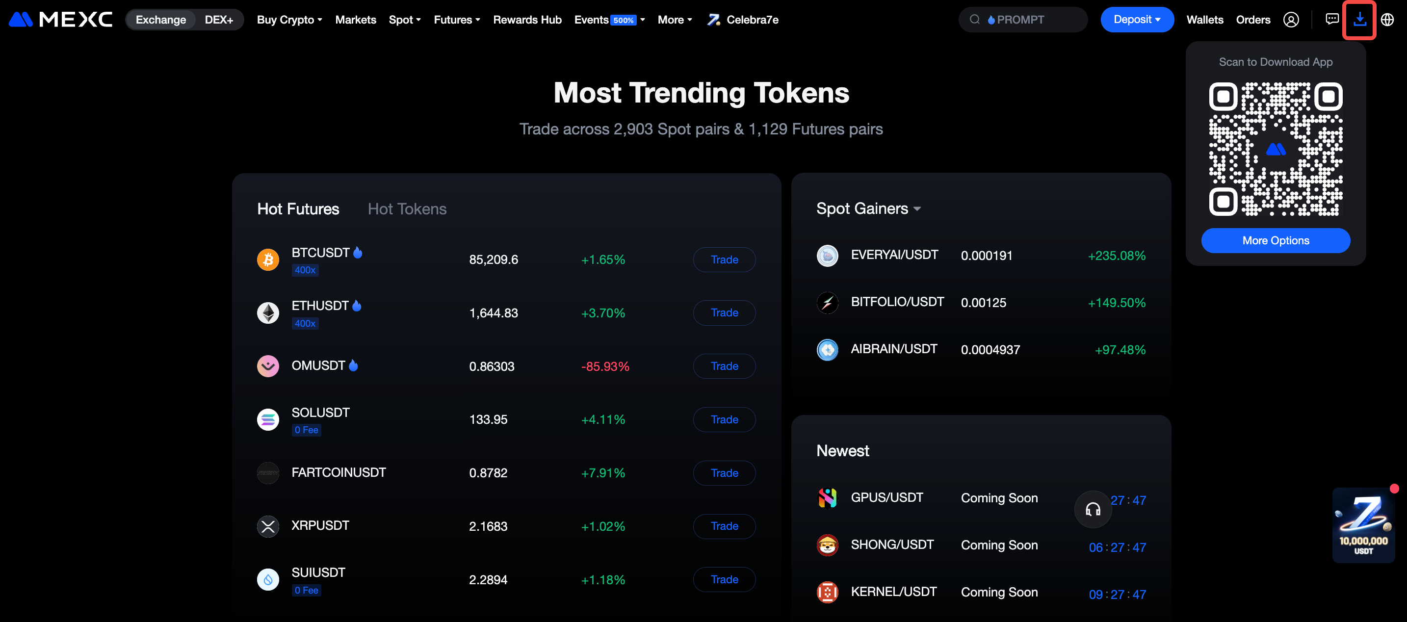 Cari dan masuk ke situs web resmi MEXC. Arahkan kursor ke sudut kanan atas situs web, lalu ikon "Pindai untuk Mengunduh Aplikasi" akan muncul. Pindai kode QR yang ditampilkan dengan ponsel Anda, lalu ikuti langkah-langkah untuk menyelesaikan instalasi.
