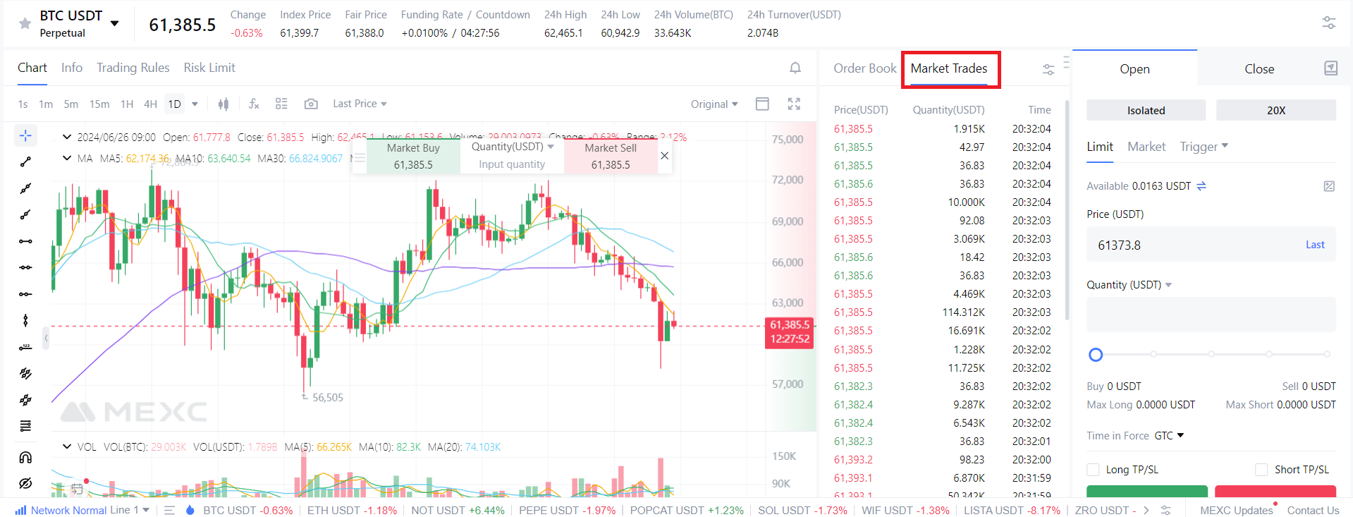 Anda dapat melihat harga ini dengan mengklik tab Perdagangan Pasar di area buku order pada halaman perdagangan Futures MEXC.