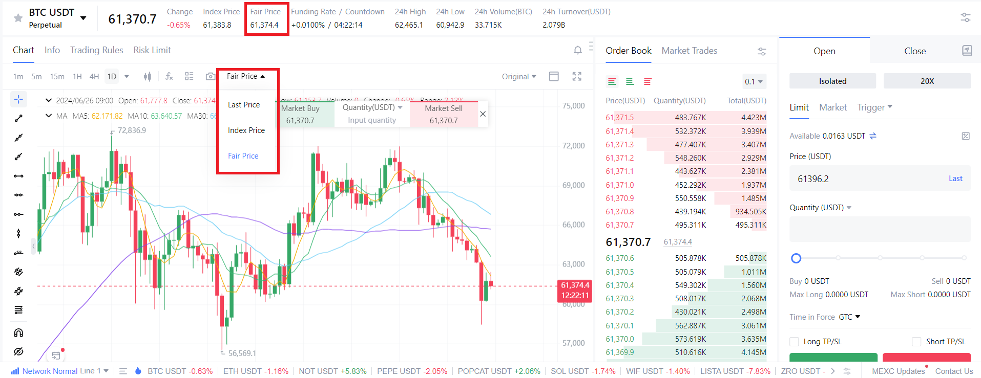 Pada halaman perdagangan Futures MEXC, Anda dapat melihat harga wajar di sisi kanan pasangan perdagangan. Anda juga dapat mengatur grafik candlestick untuk menampilkan harga wajar di bagian atas grafik.