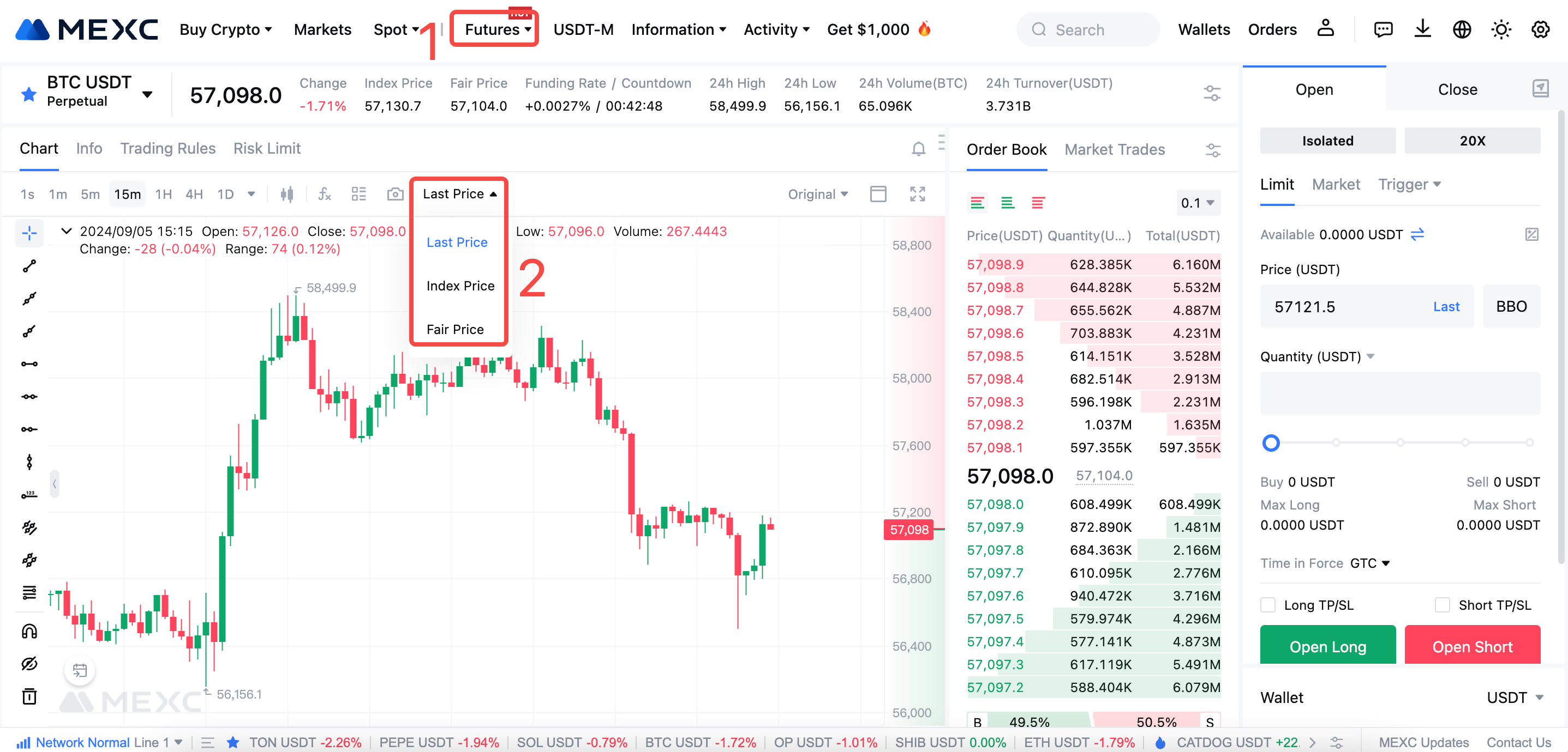 Harga terakhir adalah harga ketika pasangan Futures langsung diperdagangkan di buku order MEXC.