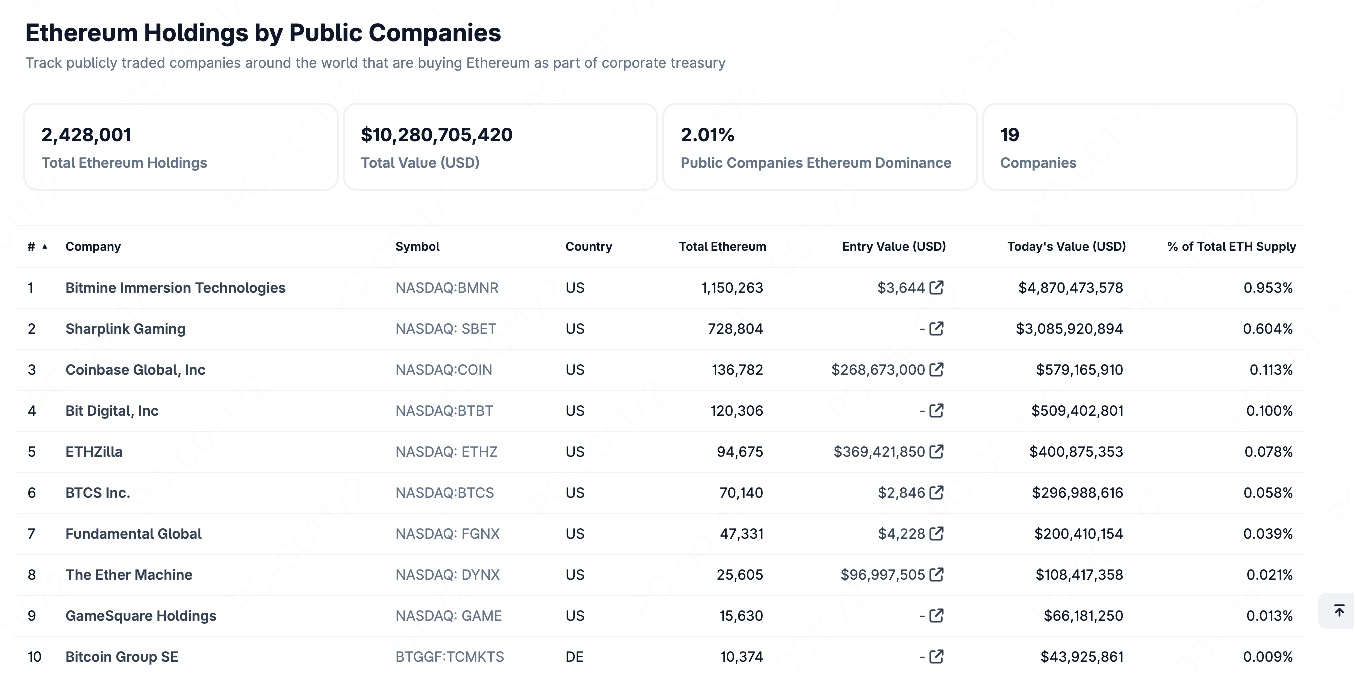 Salah satu perbedaan terbesar dalam siklus ini dibandingkan dengan siklus sebelumnya adalah keterlibatan mendalam dari para pelaku institusional. Institusi seperti BlackRock dan Fidelity memiliki Bitcoin dalam jumlah besar melalui ETF Bitcoin, dan keputusan investasi mereka memiliki dampak besar pada sentimen pasar. Pada saat yang sama, Ethereum secara bertahap mendapatkan penerimaan institusional. Data menunjukkan bahwa 19 perusahaan, dengan dipimpin oleh Bitmine Immersion Technologies dan Sharplink Gaming, secara kolektif memiliki lebih dari 2,42 juta ETH yang mencakup lebih dari 2% atas total suplai Ethereum. Hal ini jelas mencerminkan kepercayaan institusional terhadap ETH dalam jangka panjang.