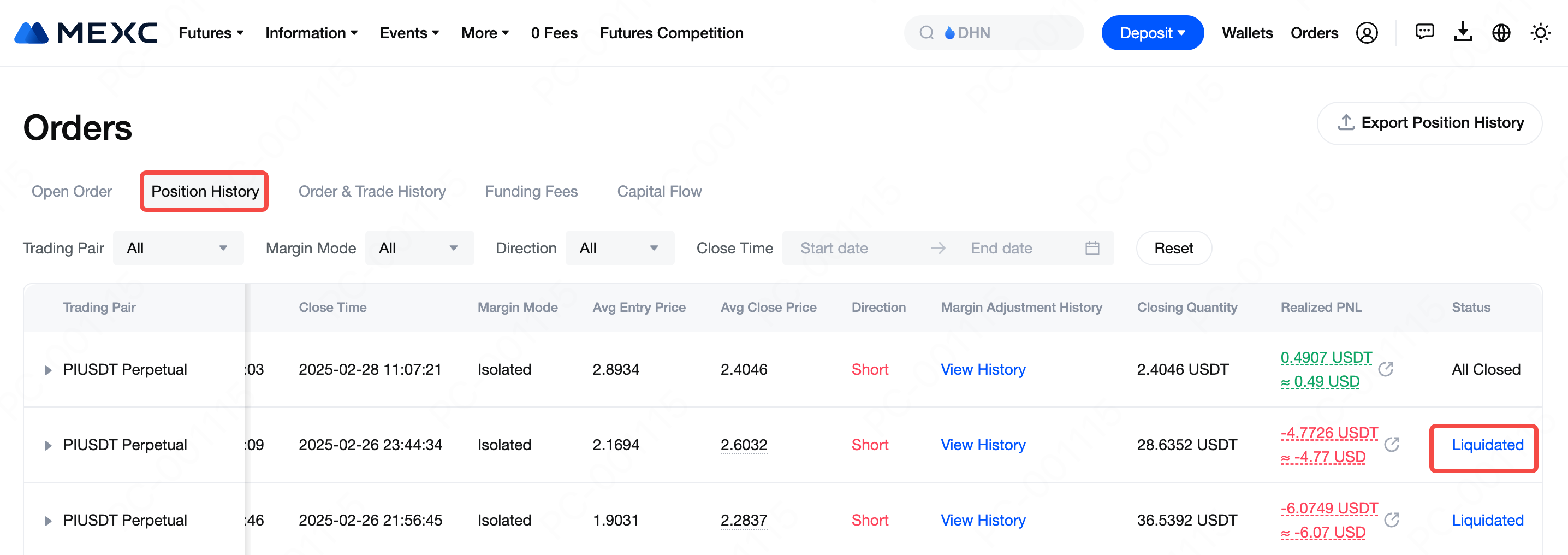 3)Lihat order Anda yang dilikuidasi dalam Riwayat Posisi.