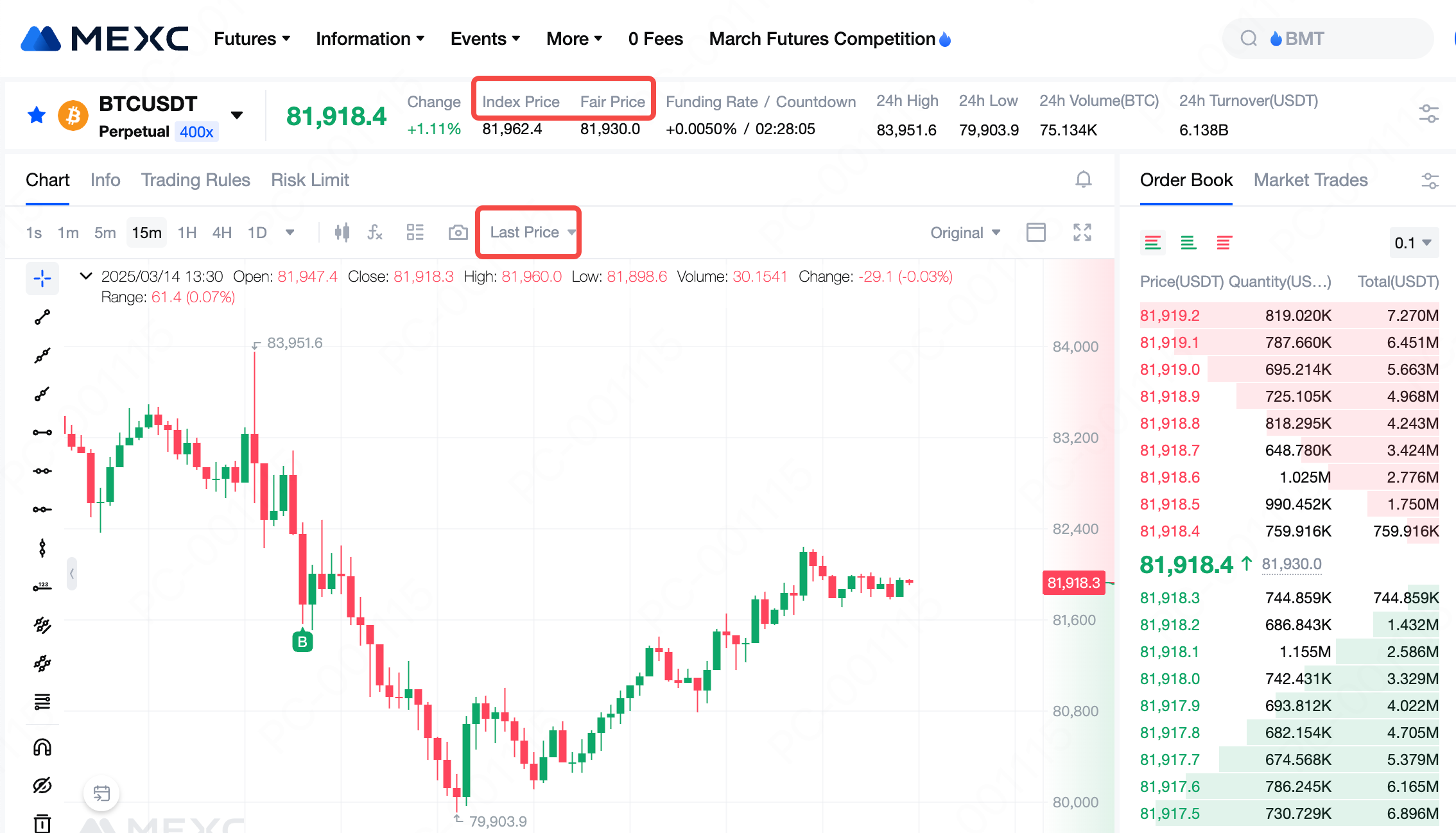 Pengguna dapat melihat harga wajar saat ini beserta penjelasannya di bagian atas halaman perdagangan. Selain itu, di bagian atas grafik candlestick, pengguna dapat beralih antara harga wajar, harga terakhir, dan harga indeks untuk melacak tren ketiga harga tersebut dengan mudah.