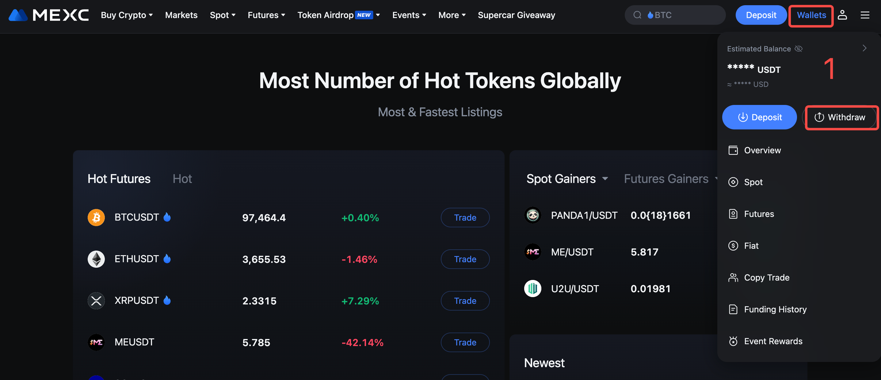 1) Di situs web resmi MEXC, klik [Dompet] di sudut kanan atas, lalu pilih [Tarik].