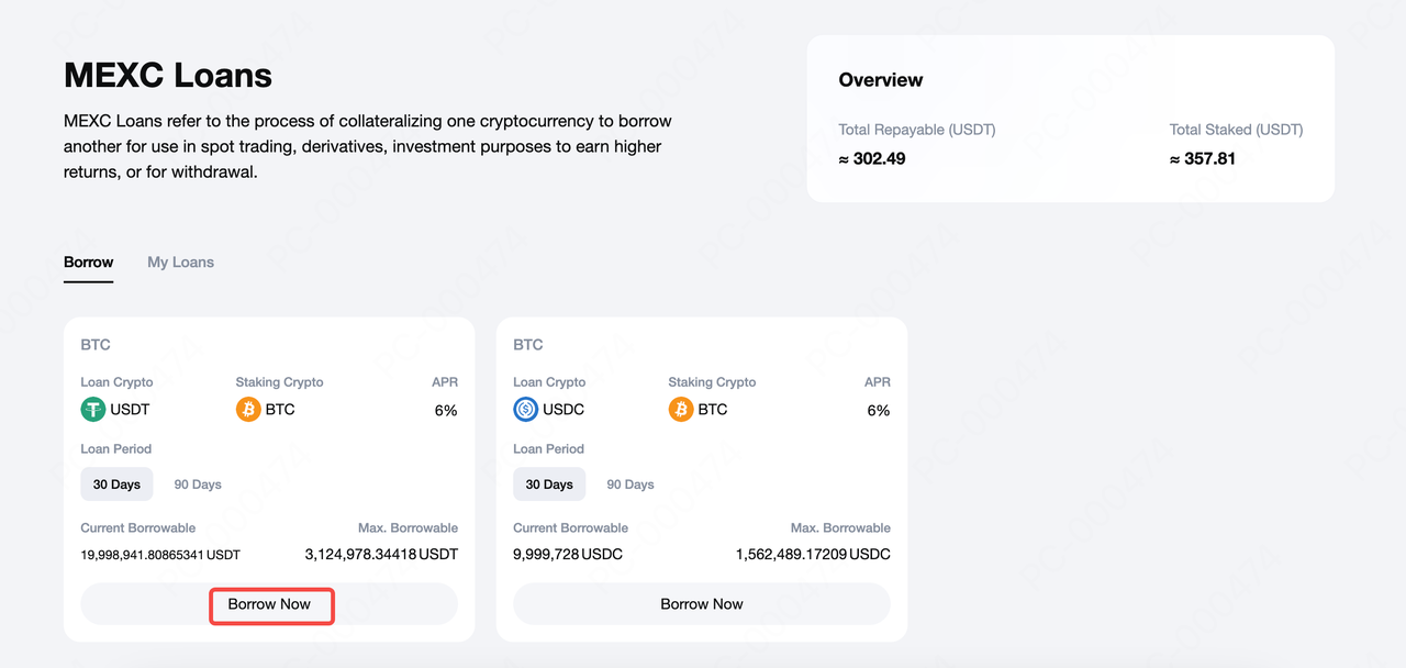 Di halaman Pinjaman MEXC, Anda dapat melihat agunan dan mata uang pinjaman yang saat ini didukung. Untuk tujuan demonstrasi, kami akan agunkan BTC untuk meminjam USDT. Klik Pinjam Sekarang untuk melanjutkan.