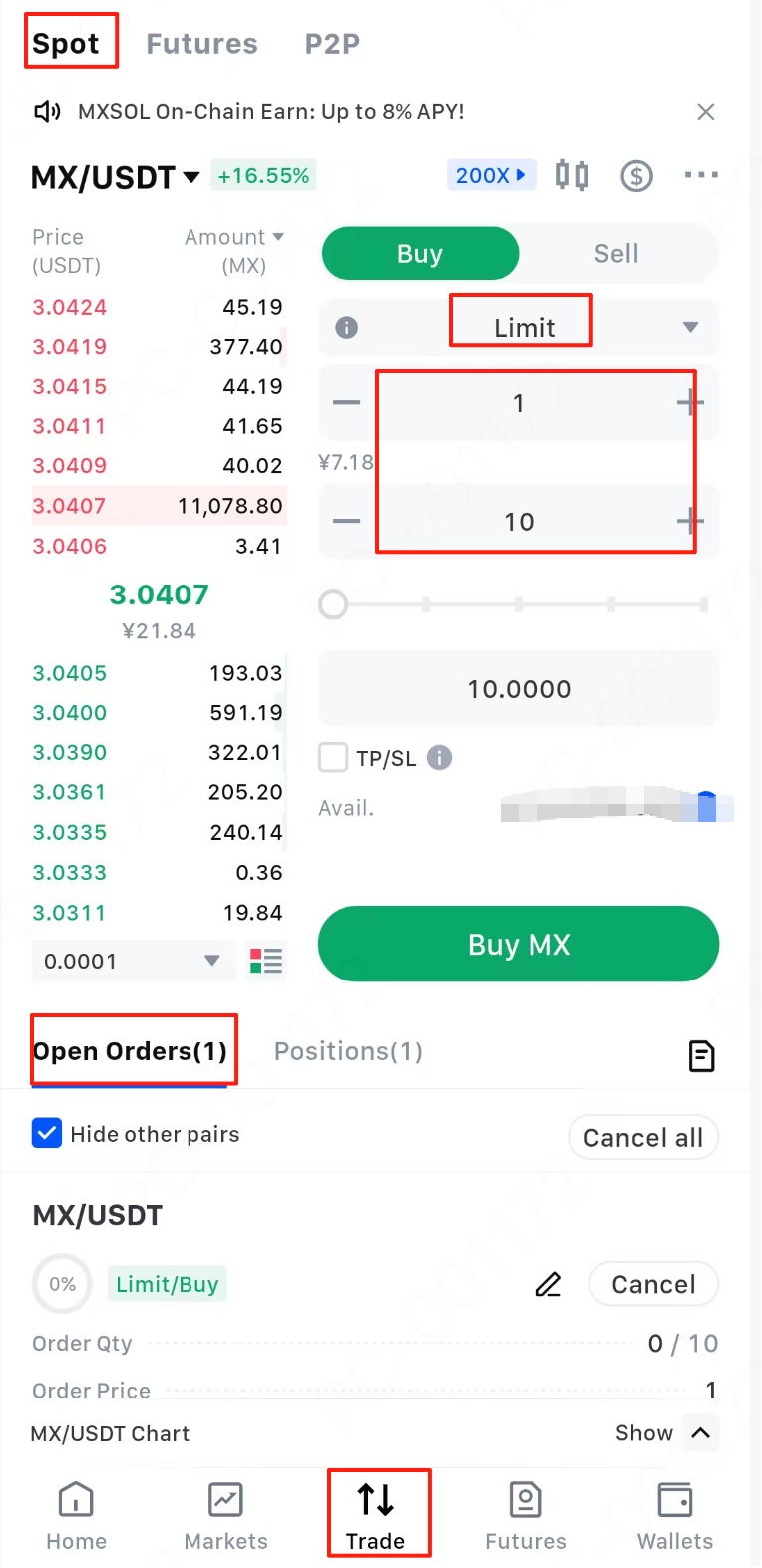 Mari kita ambil pasangan perdagangan MX/USDT sebagai contoh.