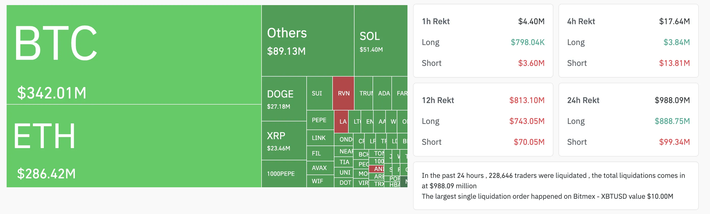 I dati di Coinglass mostrano che il mercato delle criptovalute ha perso circa il 5.1% della sua capitalizzazione totale in un solo giorno, cancellando quasi 1 miliardo di dollari di valore.
