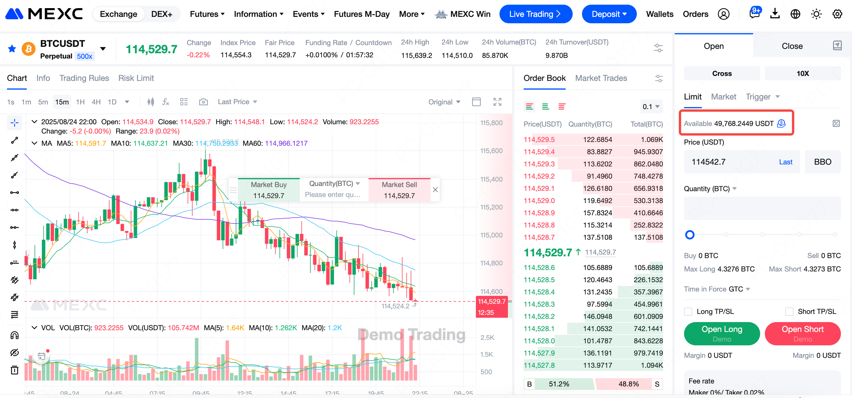 1) Valore di una simulazione realistica: il Demo trading di futures di MEXC replica in modo completo l’interfaccia, le funzioni e i dati di mercato reali, coprendo le principali coppie come BTCUSDT. Questo permette agli utenti di esercitarsi in un ambiente molto simile al mercato reale, garantendo un trasferimento fluido delle competenze al trading reale.