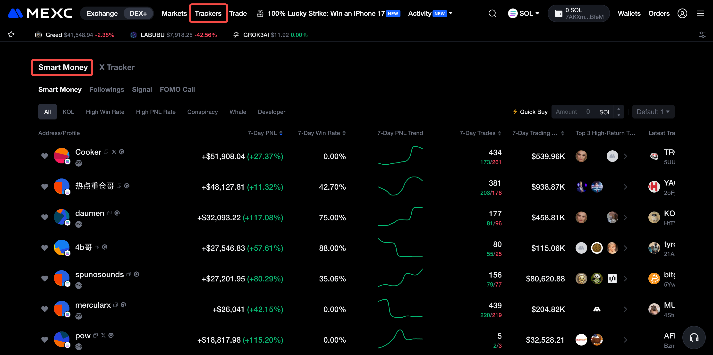 2) Esplora i tracker Smart Money/X per osservare le tendenze del mercato.