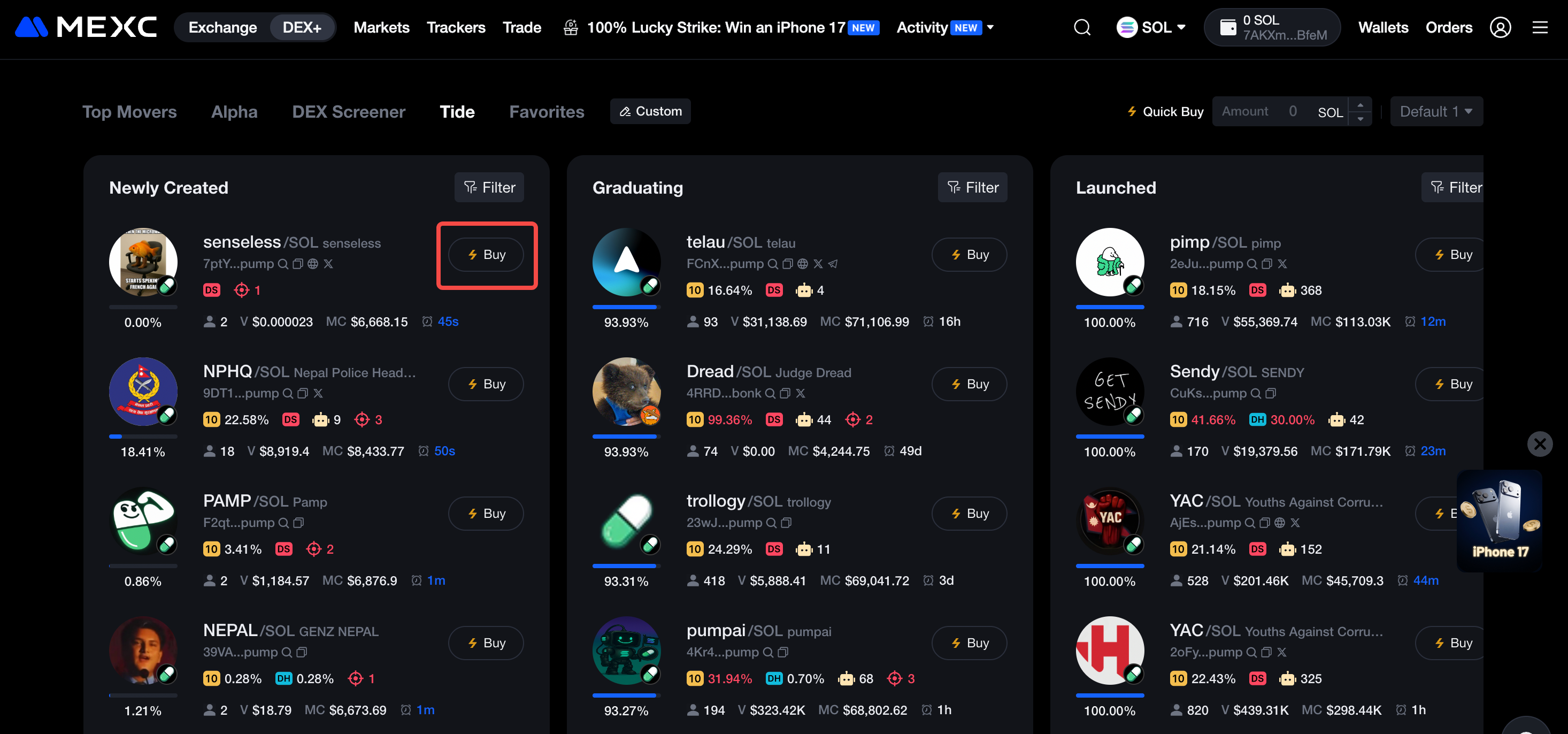I principianti possono utilizzare la pagina Tide per trovare rapidamente i token di loro interesse, quindi utilizzare la funzione Acquista per acquistarli con un solo clic.