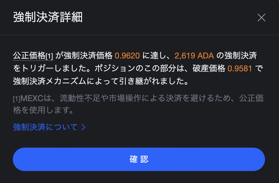 強制決済(清算またはマージンコールとも呼ばれます)は、プラットフォームがユーザー様のポジションを自動的に決済することを指します。MEXCでは、維持証拠金率(MMR)がユーザー様のポジションリスクや資産全体のエクスポージャーを示す主要な指標となります。維持証拠金率が100%またはそれ以上になると、システムは自動的にユーザー様のポジションを強制決済します。強制決済を避けるため、ユーザー様は維持証拠金率の変動を常に注意深く確認することが強く推奨されます。