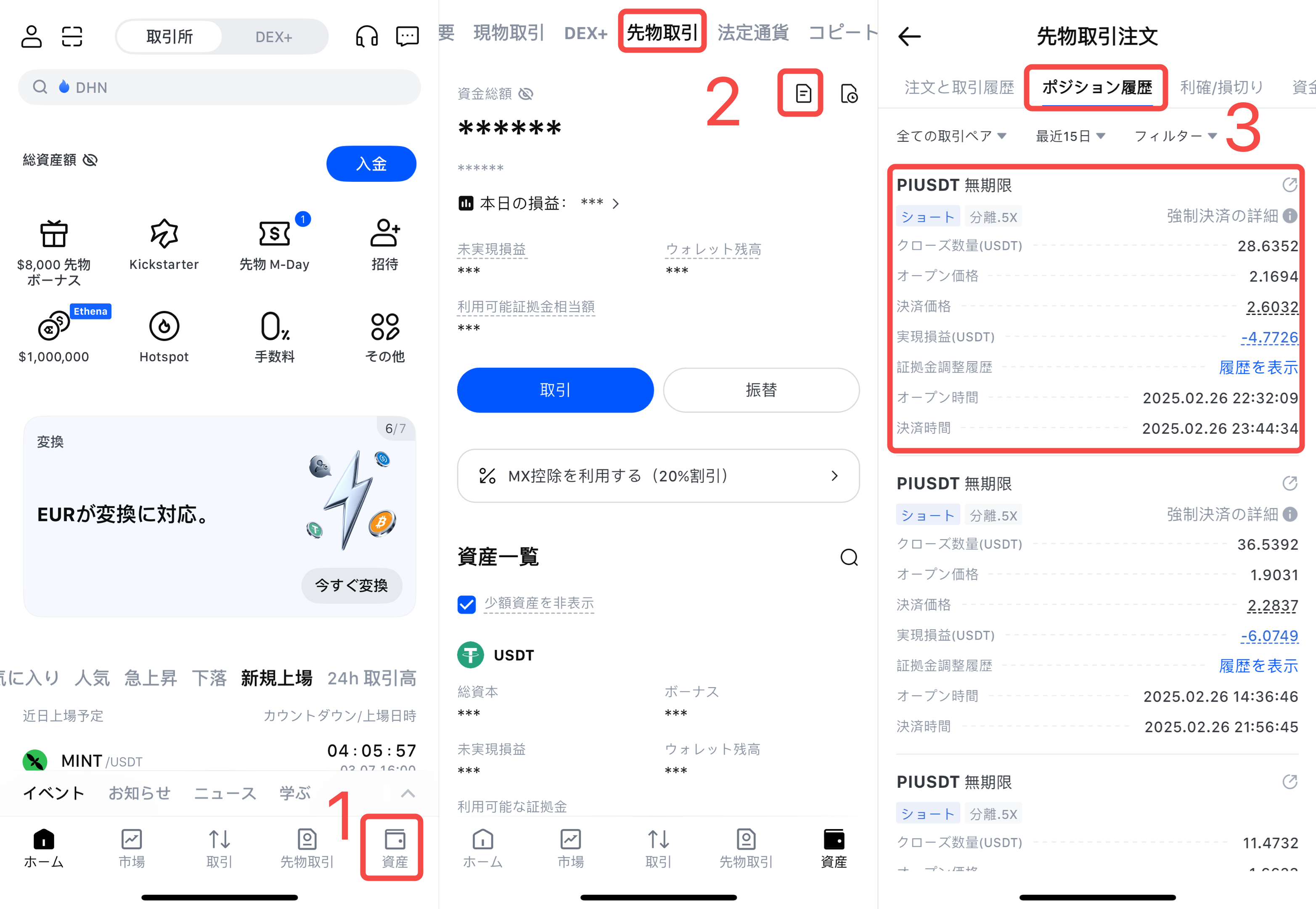 1)MEXCアプリにログインし、下部にある[資産] をタップして資産ページを開きます。