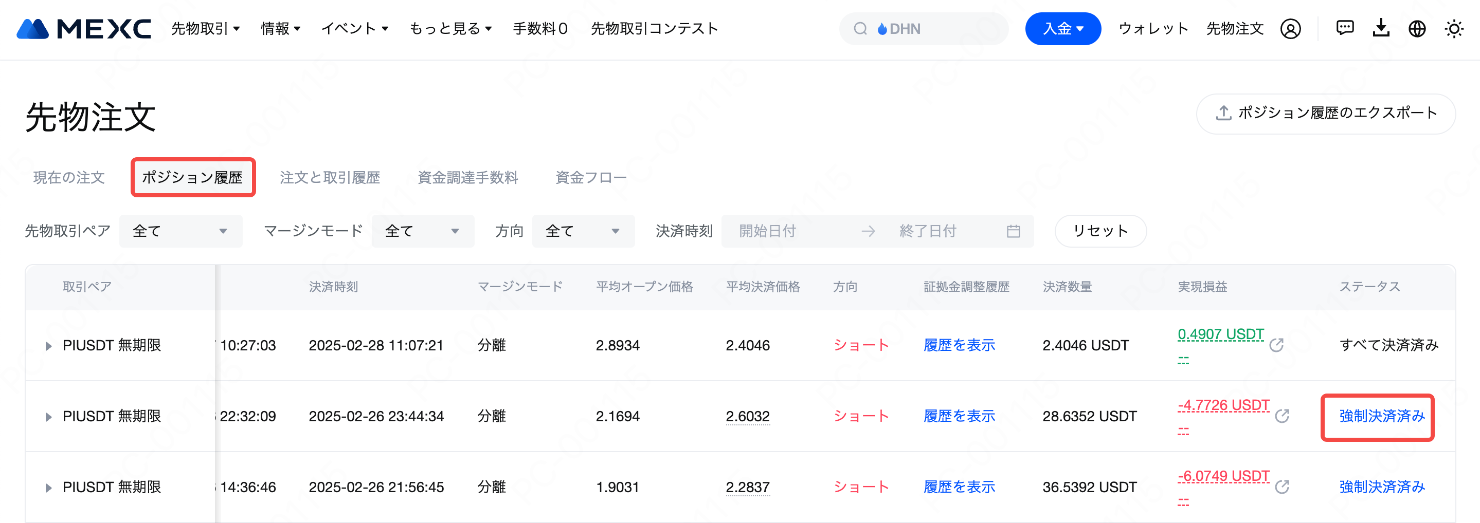 強制決済注文は、[ポジション履歴] セクションでご確認いただけます。