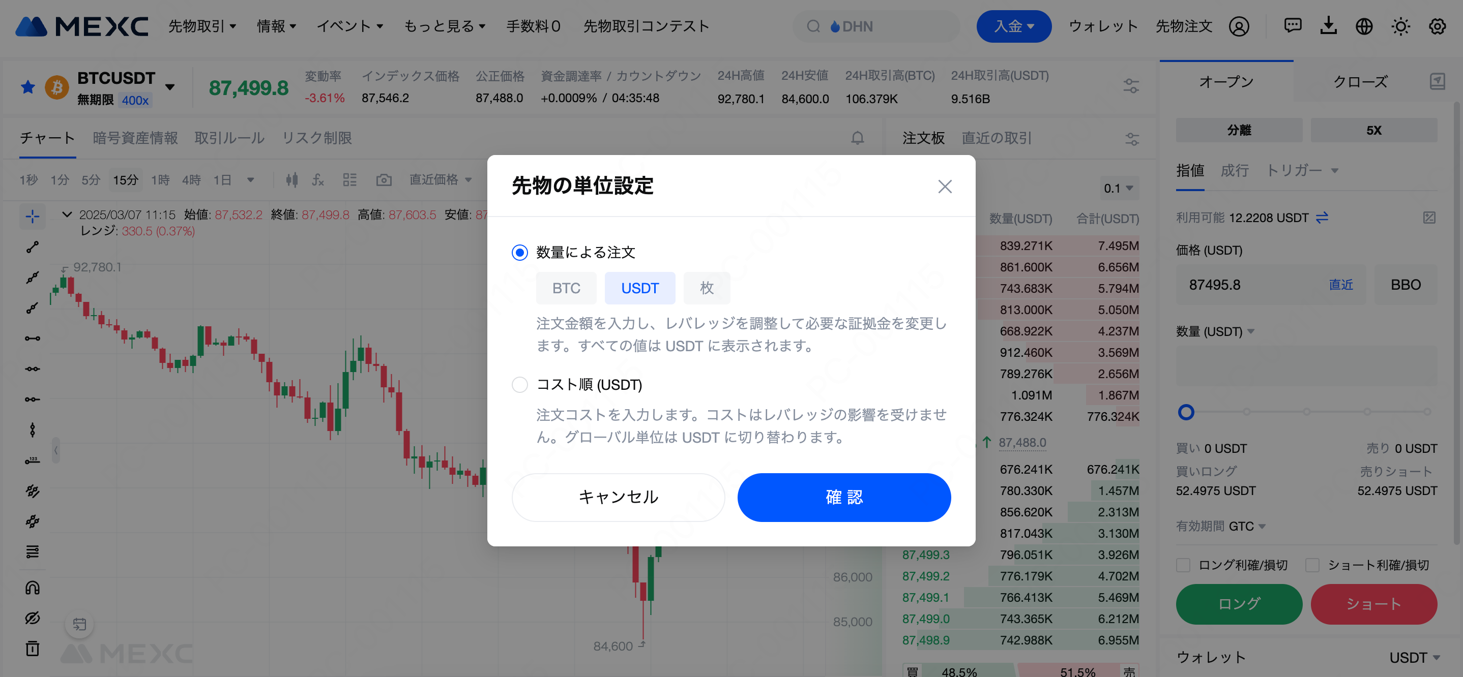 USDT-M 先物取引において契約単位をUSDTではなく数量または枚数に設定すると、ポジション履歴に表示される強制決済数量は、ユーザー様がポジションをオープンした際の数量と異なる場合があります。