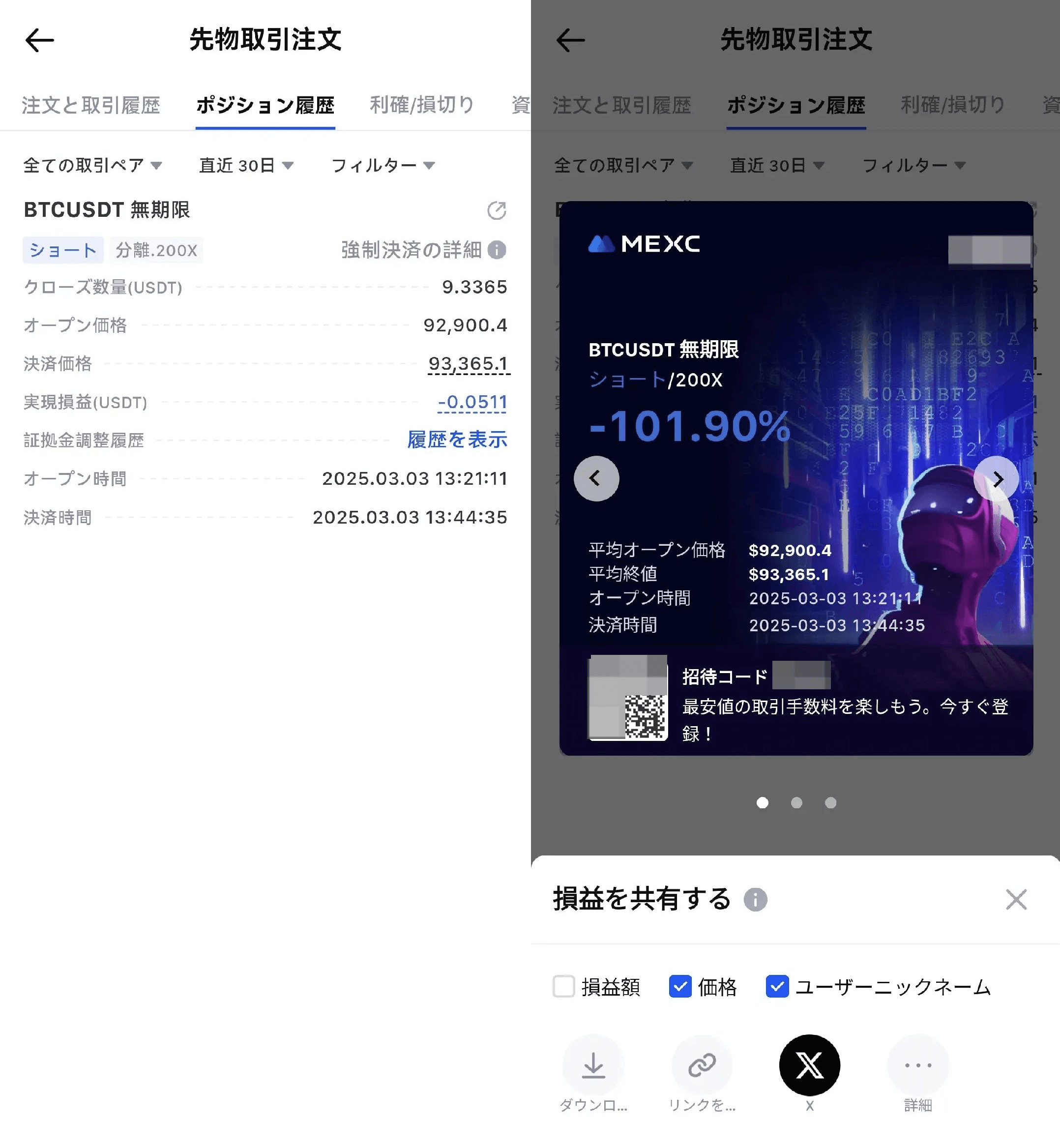 強制決済価格は引き継ぎ価格とは異なります。強制決済価格はあくまでトリガーとなる価格です。強制決済が発生すると、強制決済エンジンがユーザーのポジションを引き継ぎ価格で決済します。ポジション履歴や [損益を共有する] ページに表示される平均決済価格は、この引き継ぎ価格を指します。
