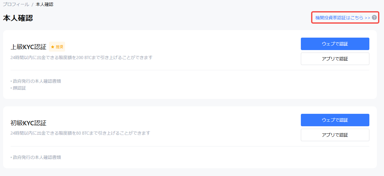 MEXCプラットフォームのアカウントでは、個人認証と機関投資家認証の両方を提供しており、どちらを選択するかによって認証方法が異なります。個人認証について詳しく知りたい場合は、「本人確認の方法」をお読みください。以下の記事は、機関投資家認証について紹介しています。 1. なぜ機関投資家認証が必要なのですか? 機関投資家認証を完了すると、アカウントの出金限度額が引き上げられます。24時間の限度額が40MEXCプラットフォームのアカウントでは、個人認証と機関投資家認証の両方を提供しており、どちらを選択するかによって認証方法が異なります。個人認証について詳しく知りたい場合は、「本人確認の方法」をお読みください。以下の記事は、機関投資家認証について紹介しています。 1. なぜ機関投資家認証が必要なのですか? 機関投資家認証を完了すると、アカウントの出金限度額が引き上げられます。24時間の限度額が40