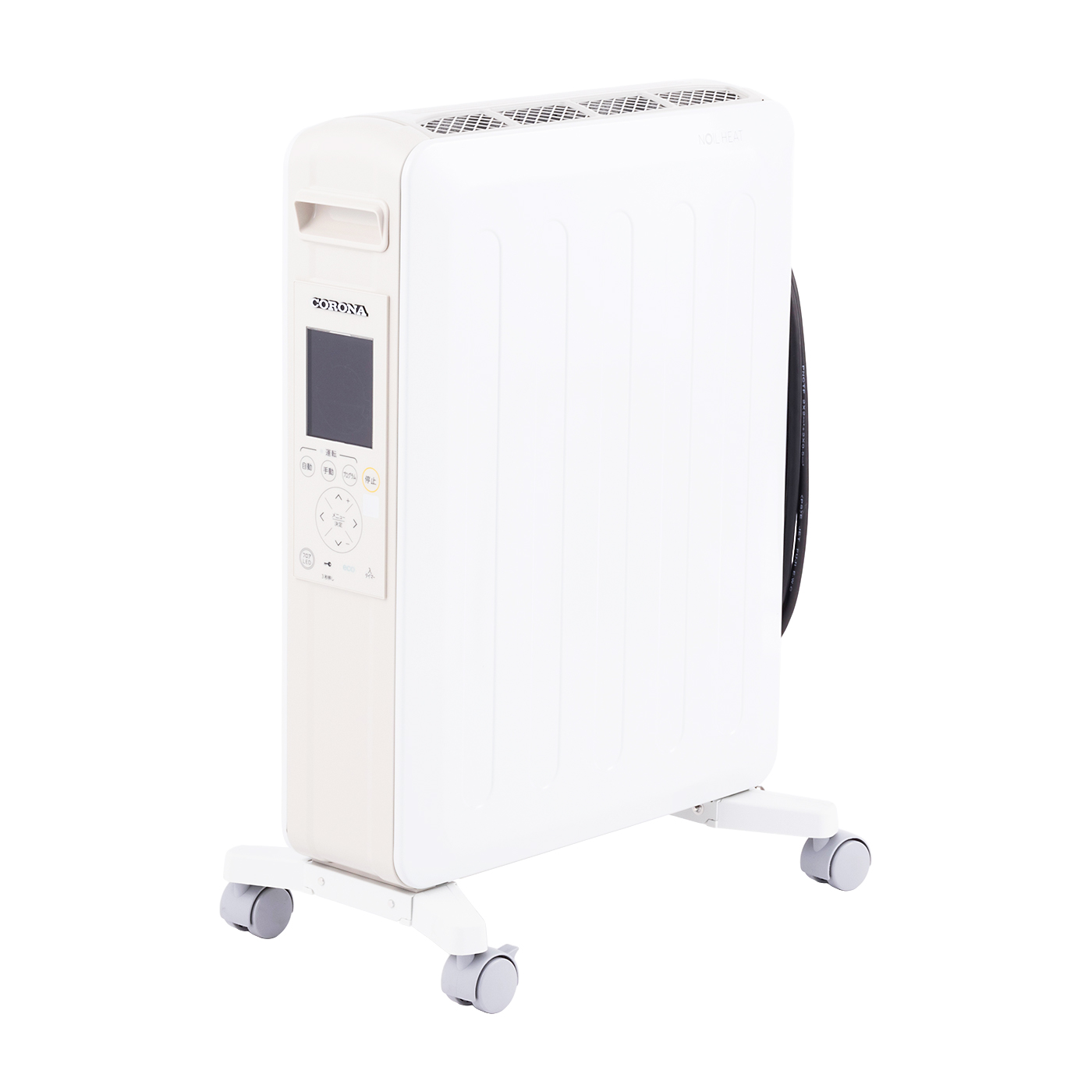 コロナの「オイルレスヒーター ノイルヒート DHS-1524-CW」は、シンプルな見た目で、素早く暖まれるうえに高性能なものがほしい人におすすめです。落ち着いたデザインなので、インテリアになじみやすいヒーターを設置したい人にもよいでしょう。速暖性の高さは、検証したなかでもトップクラスの高評価です。室温が20℃に到達するまでの時間はわずか平均21分と速く、寒い部屋でもスピーディに暖まります。20℃に到達してから45分間の室温は25.63℃で、速く暖まる分設定温度より少し暖まりすぎる印象も。とはいえ、温度調節をしなくても比較的適温をキープしやすいといえそうです。安全性は申し分ありません。温度は上部・側面ともに50℃以下と低めで、触れてもすぐにやけどしない温度。側面カバーに加え、転倒オフスイッチ・チャイルドロック・過熱防止装置など、安全性に配慮された機能も充実していました。機能性も高評価を獲得。リモコンからも操作可能で、入切タイマーのほかに、プログラムタイマーも搭載しています。3つのパターンをスケジューリングできるため、平日・休日などライフスタイルに合わせて設定したい人にもぴったりです。本体での操作はボタン式で場面によっては連打が必要なので、温度やタイマーなどの細かい設定ではやや手間がかかる印象。また、電気代は安いとはいえず、20℃に到達するまでの電気代は9.3円に抑えられていたものの、20℃に達してからは18.9円と高めでした。高価格帯の商品だけあって速暖性は申し分なく、機能も充実したモデルです。シンプルなデザインと性能のよさにこだわる人はぜひ候補に入れてくださいね。