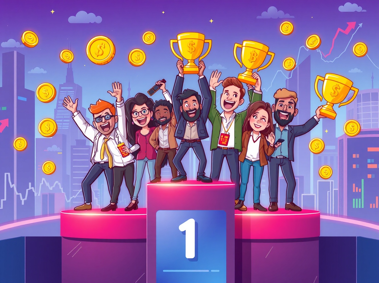 Cartoon traders celebrating victory in the Bitget King of Trading 2025 competition with prizes.