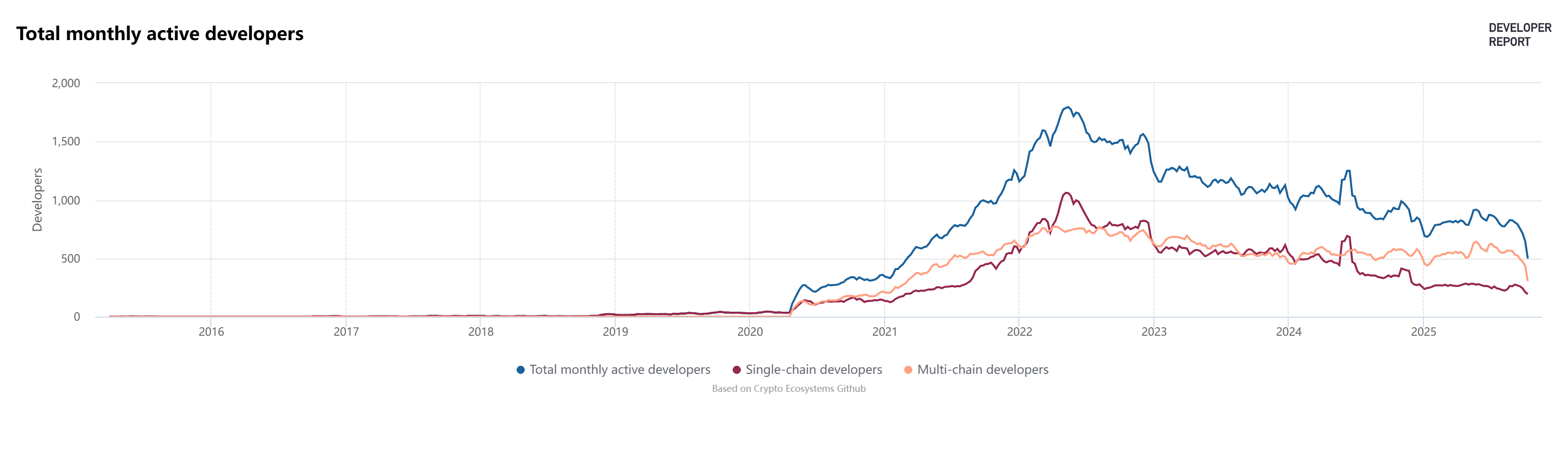 Meanwhile, NEAR faces competition from other public chains like Ethereum, BSC, Solana, and Avalanche for high-quality projects and developer resources. Over the past two years, NEAR's monthly active developer count has been declining, and its cross-chain developer base has seen a significant outflow in recent months, approaching the lows of the past year, signaling a shift toward contraction and restructuring.